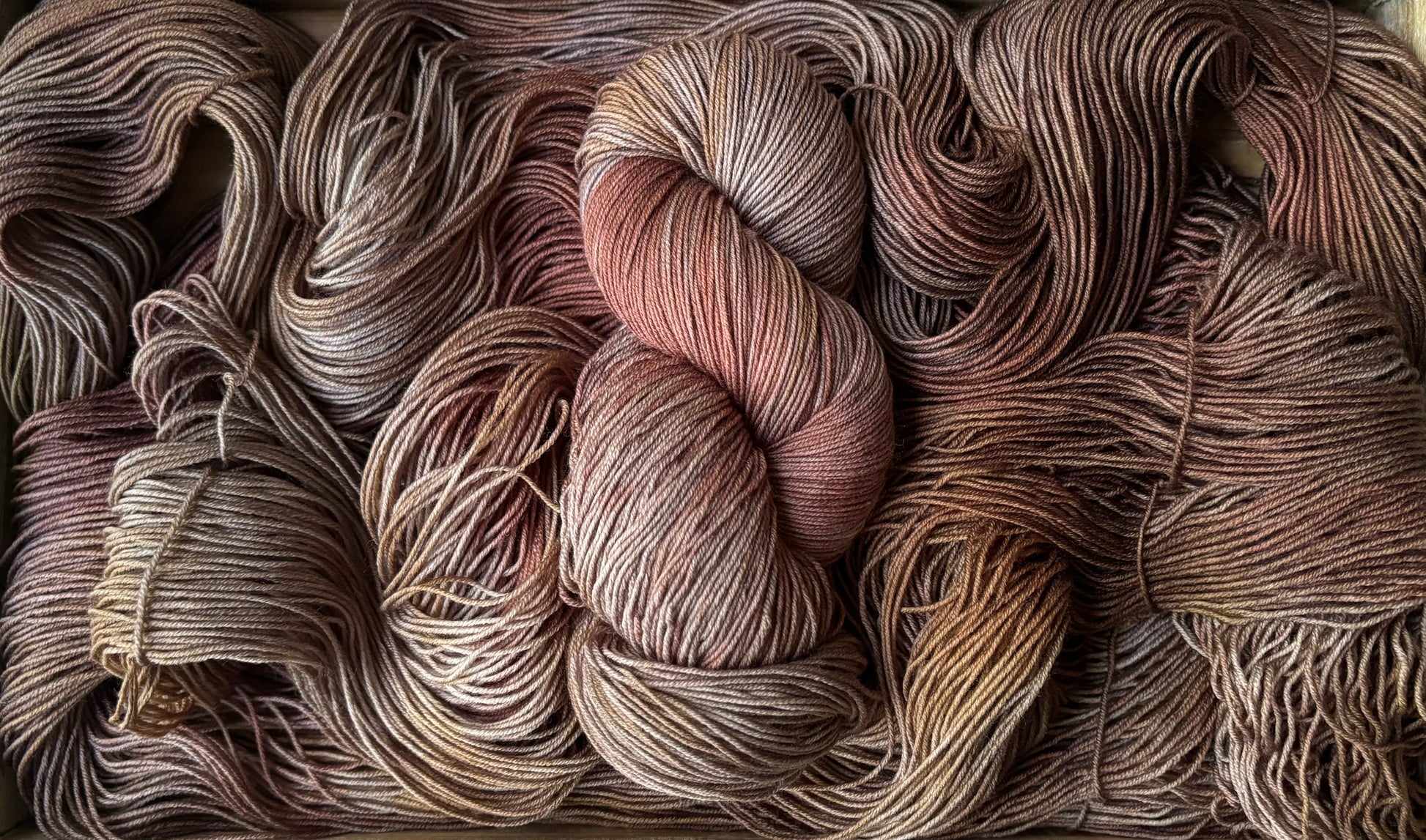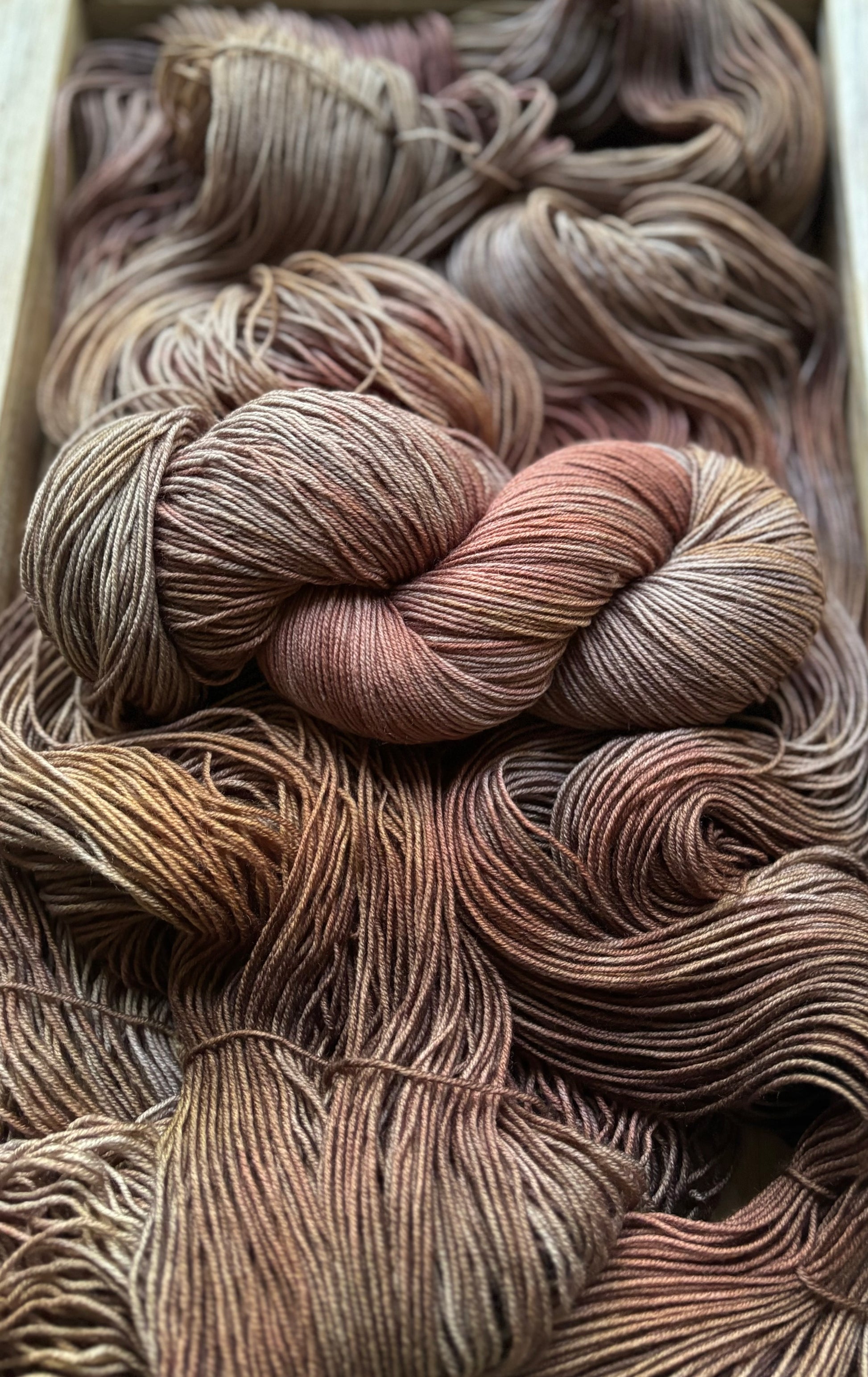 Timber Island is a colourway full of warm, earthy browns and neutrals with pops of cedar and very subtle hints of gold. Quite similar to its 'sibling' Pressed Flowers, Timber Island is missing those hues of mauve and green found in the other.