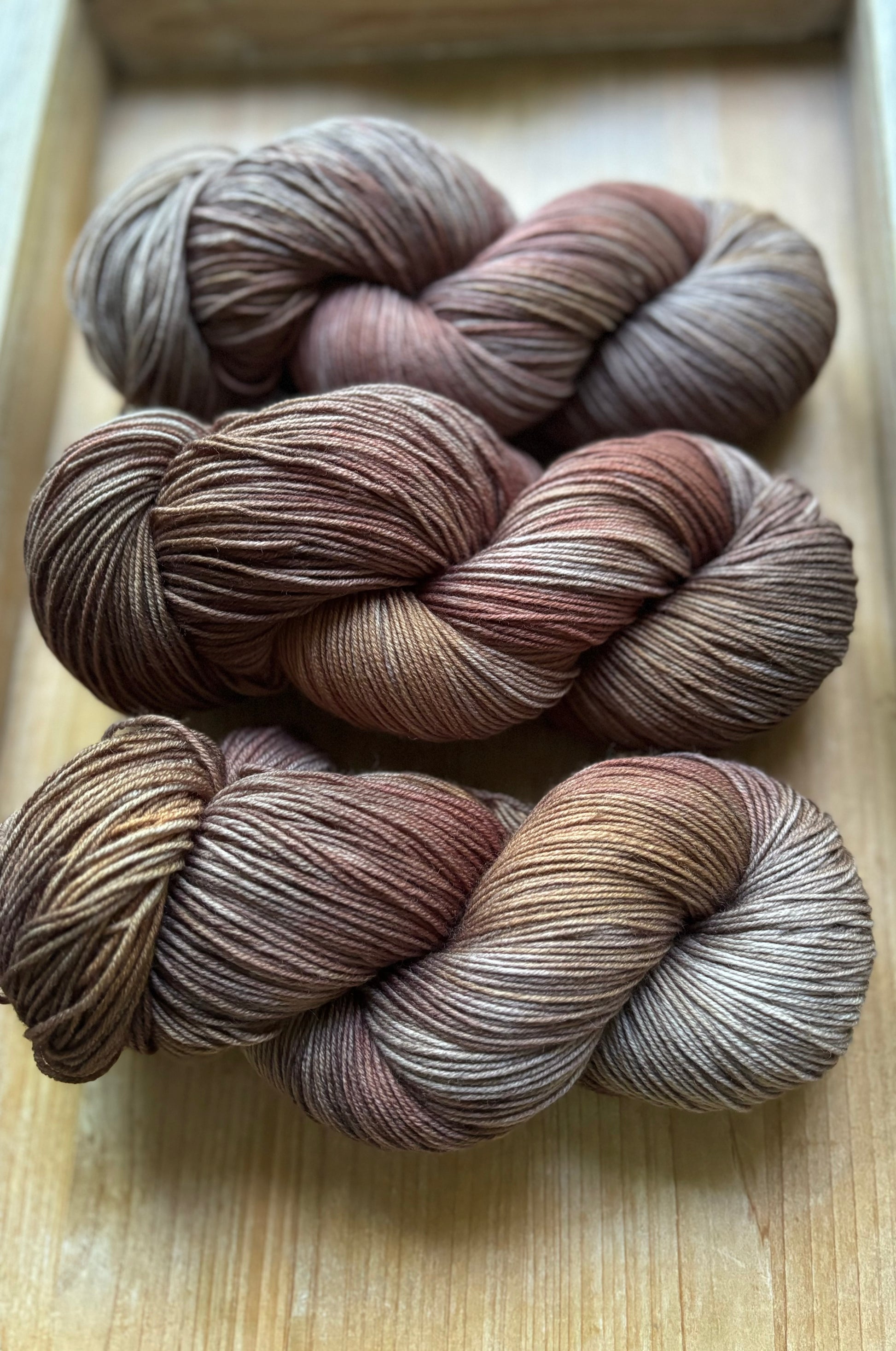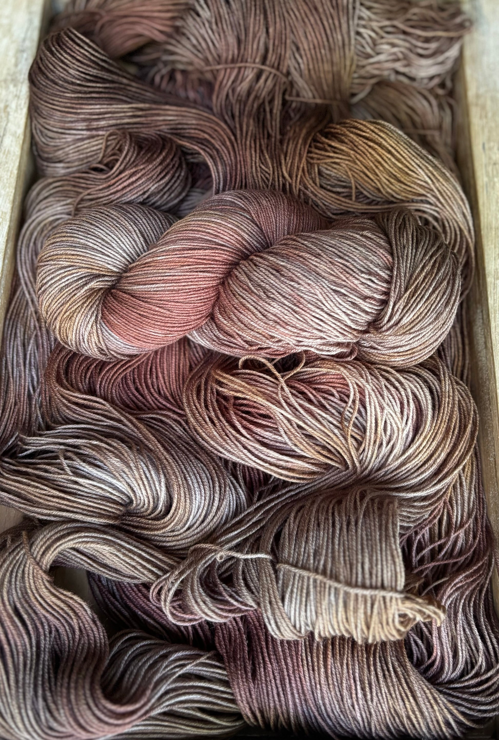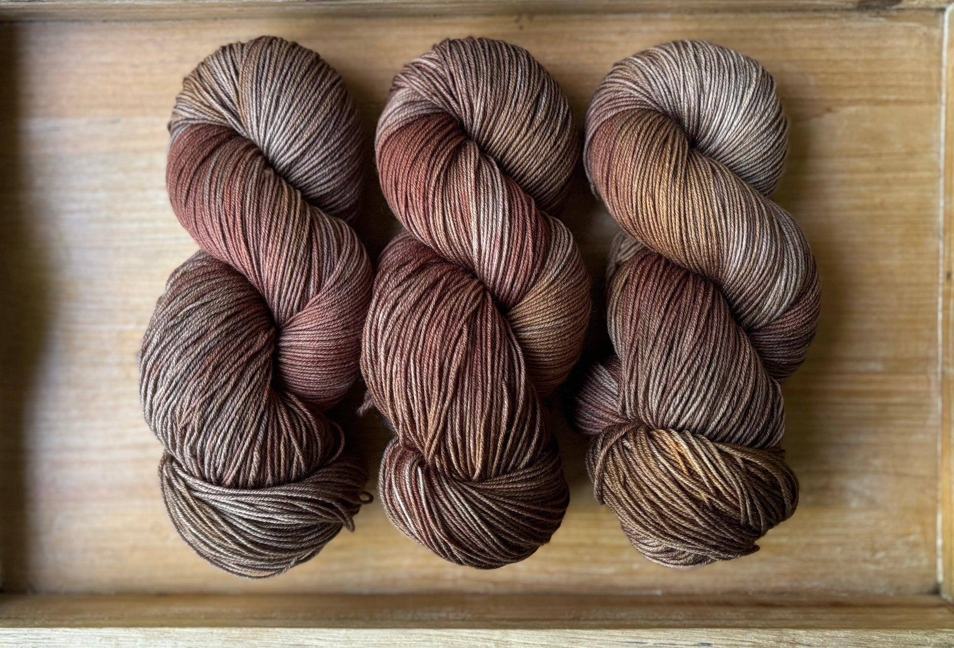Luxe Sock Base: Luxe Sock is made up of 75% Ultra Fine Merino Wool, 15% Mulberry Silk, and 10% Cashmere. Each skien is 100 grams and 437 yards, 2ply construction. This yarn base is heavenly soft against the skin, and perfect for a special project calling for a high end fingering weight yarn. The Mulberry Silk adds drape and lustre, and the cashmere creates a fuzzy halo effect as you work with it. The colours of dye tend to shine through, looking much more striking and rich compared to some of my samples on Superwash bases. Fibres in this base are sourced from Australia, the wool used in this yarn is ethically produced from sheep that have NOT been mulesed. Hand wash only, lay flat to dry.