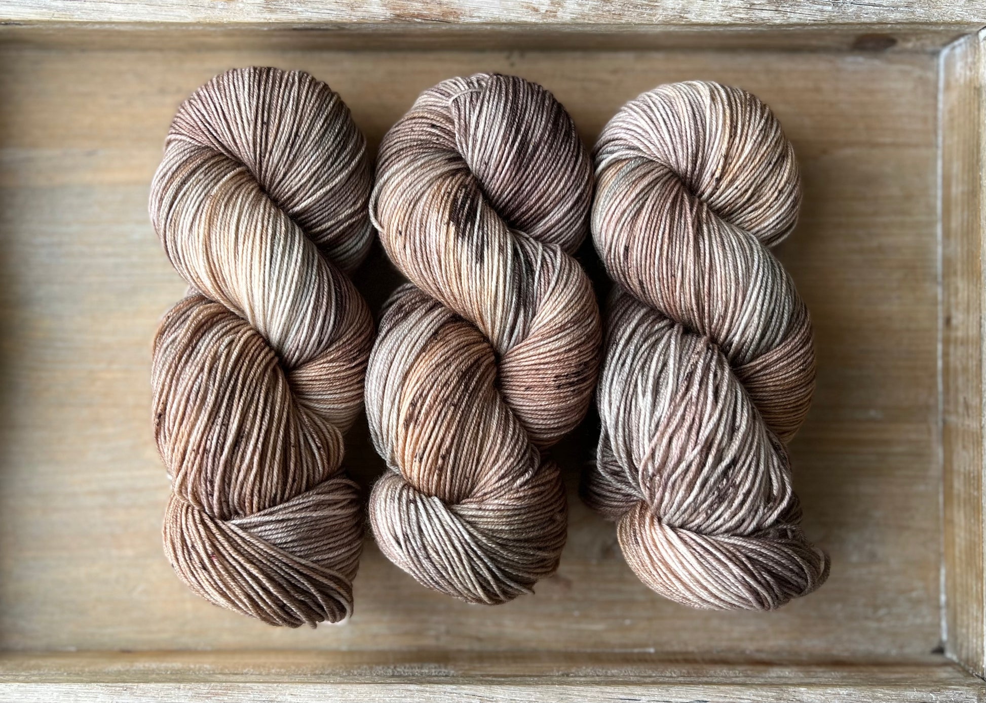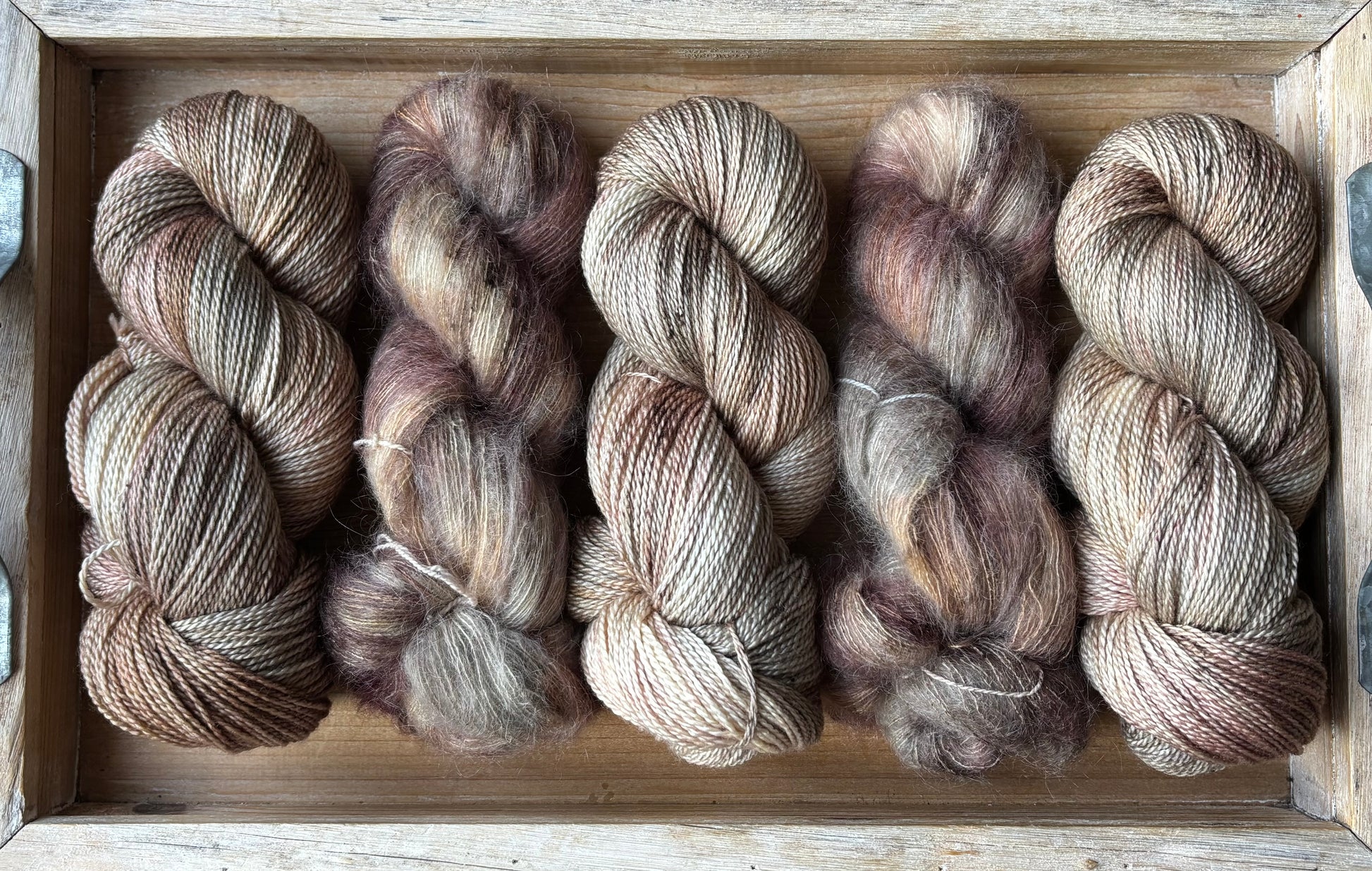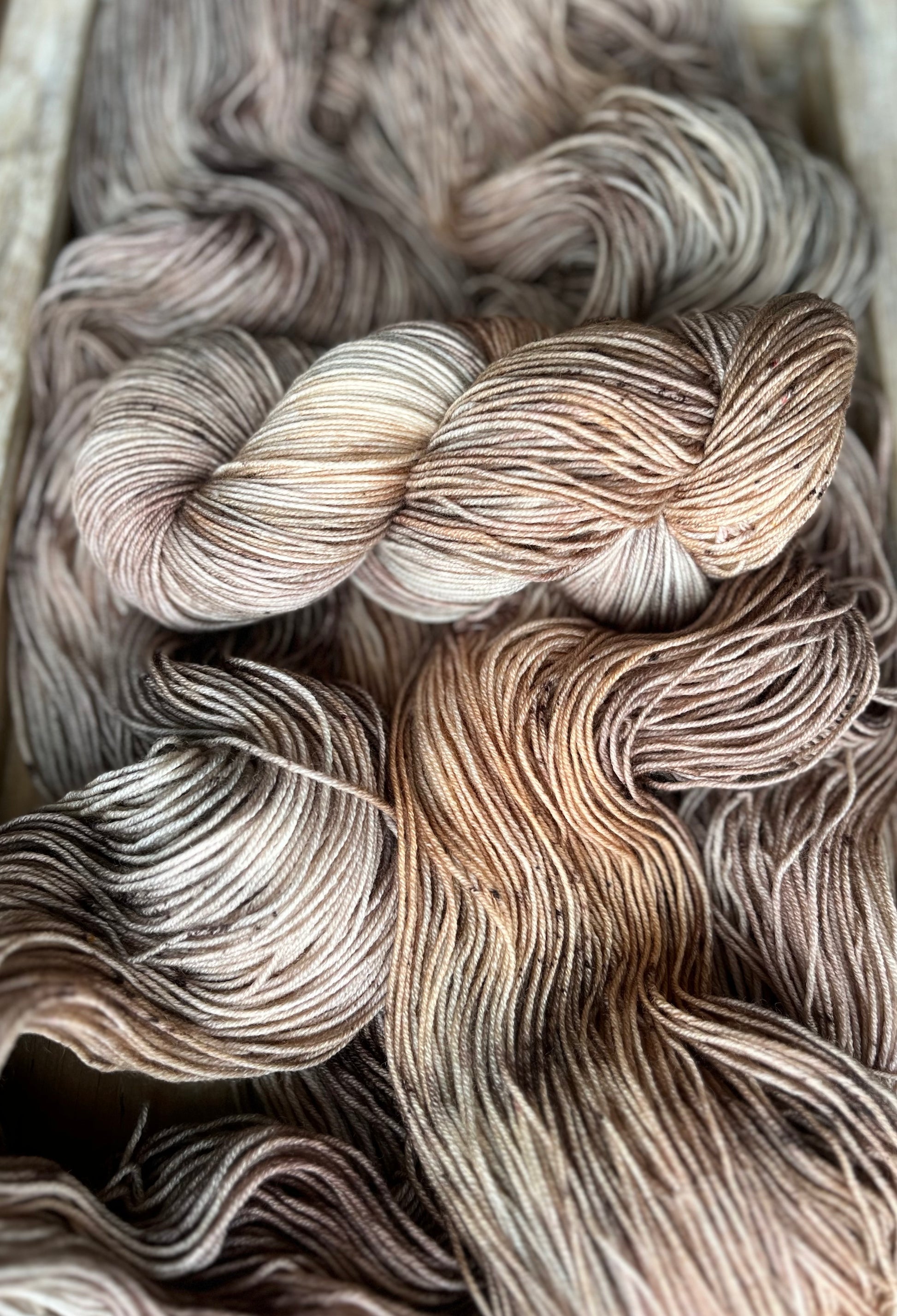 Luxe Sock Base: Luxe Sock is made up of 75% Ultra Fine Merino Wool, 15% Mulberry Silk, and 10% Cashmere. Each skien is 100 grams and 437 yards, 2ply construction. This yarn base is heavenly soft against the skin, and perfect for a special project calling for a high end fingering weight yarn. The Mulberry Silk adds drape and lustre, and the cashmere creates a fuzzy halo effect as you work with it. The colours of dye tend to shine through, looking much more striking and rich compared to some of my samples on Superwash bases. Fibres in this base are sourced from Australia, the wool used in this yarn is ethically produced from sheep that have NOT been mulesed. Hand wash only, lay flat to dry.