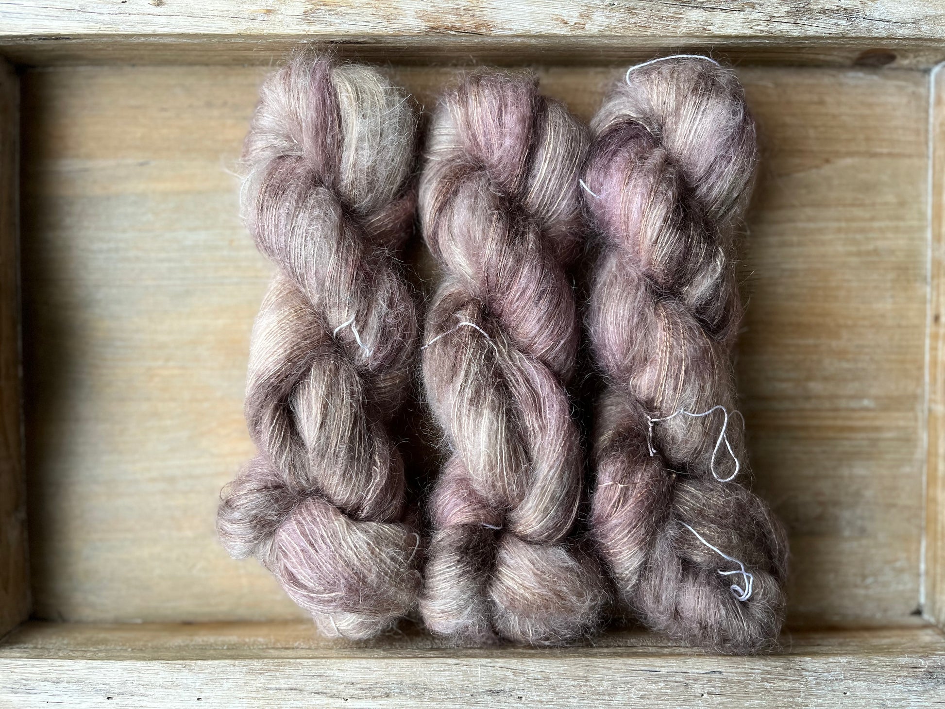 Mohair Halo Base: A delicate, lace weight yarn made up of 72% Superkid Mohair and 28% Mulberry Silk. Each skein is 50 grams and 460 yards, single ply construction. This yarn is lovely on it’s own, but is also amazing when held together with another yarn base. The fuzziness of the mohair creates a halo of colour within your project. Fibres in this base are sourced from South Africa. Hand wash only, lay flat to dry.