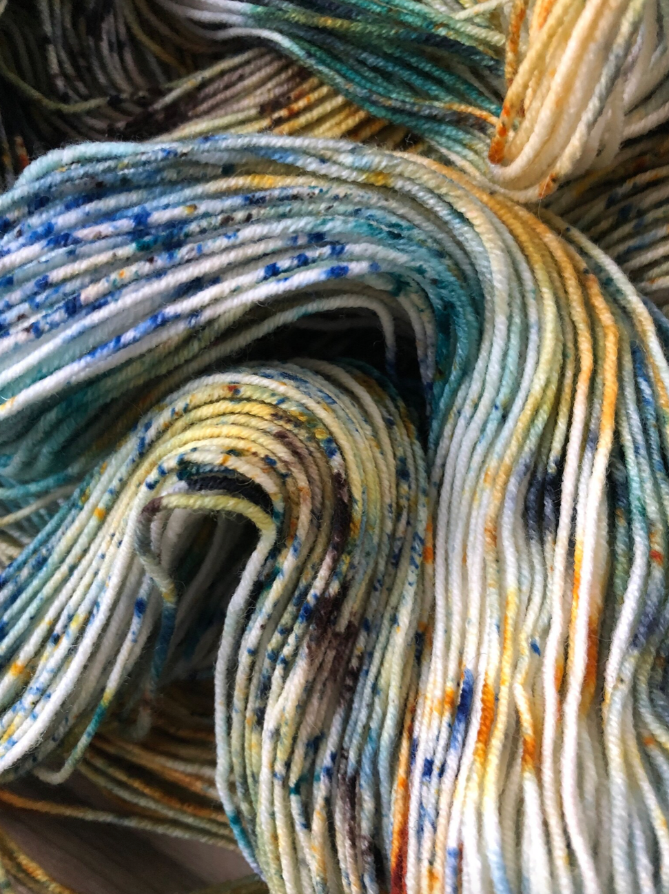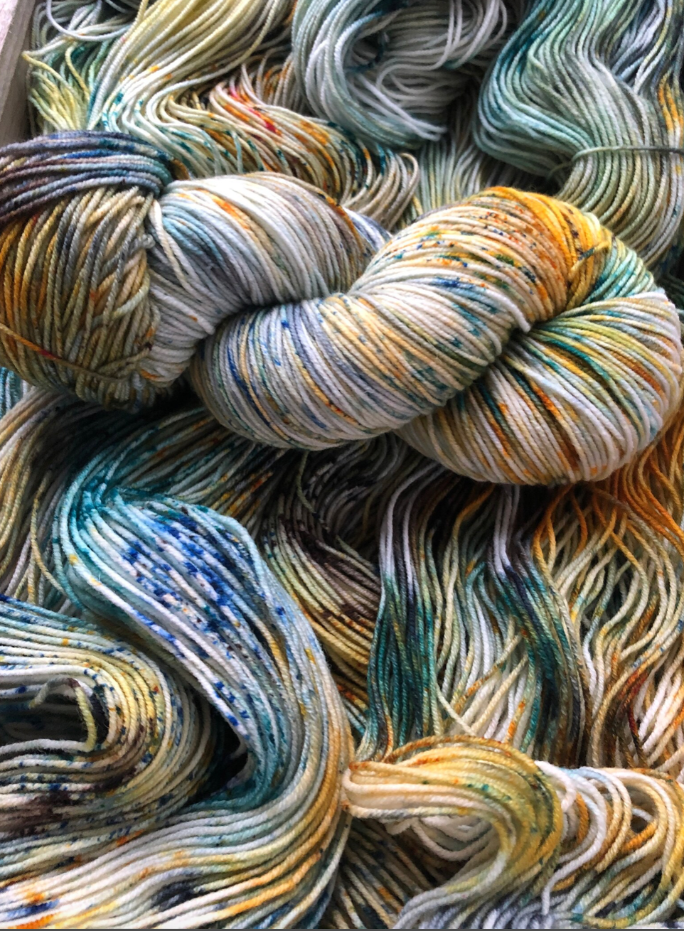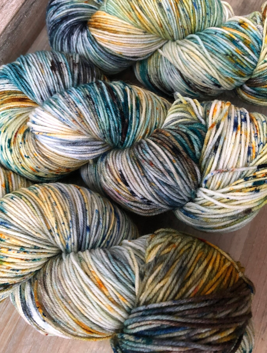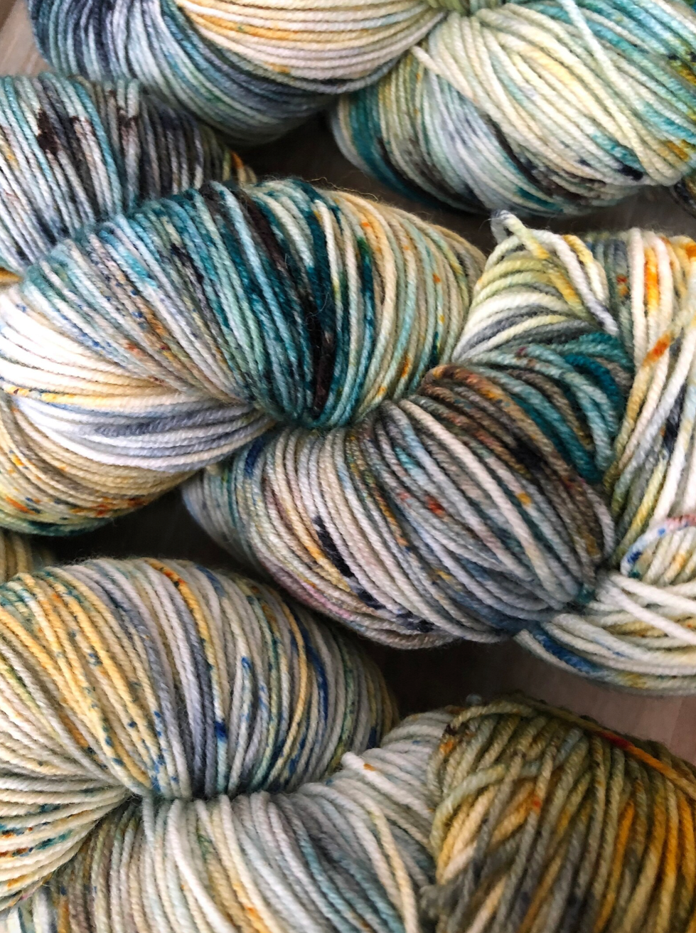 Tupelo Honey is such a gorgeous mix of golds, blues and greens, with tons of speckles to keep things lively. Photographing these colourways was challenging, because it's difficult to capture how truly special each skein is. Even when dyed in the same batch, in the same pan, each skein is truly one of a kind. And once twisted into a skein, we loose a lot of visibility of the swirling blends of colours and speckles. Once you unwrap the yarn, all the beauty is released and you can really see how special these colourways are. Alternating skeins in between rows is suggested when using any colourway like this one!