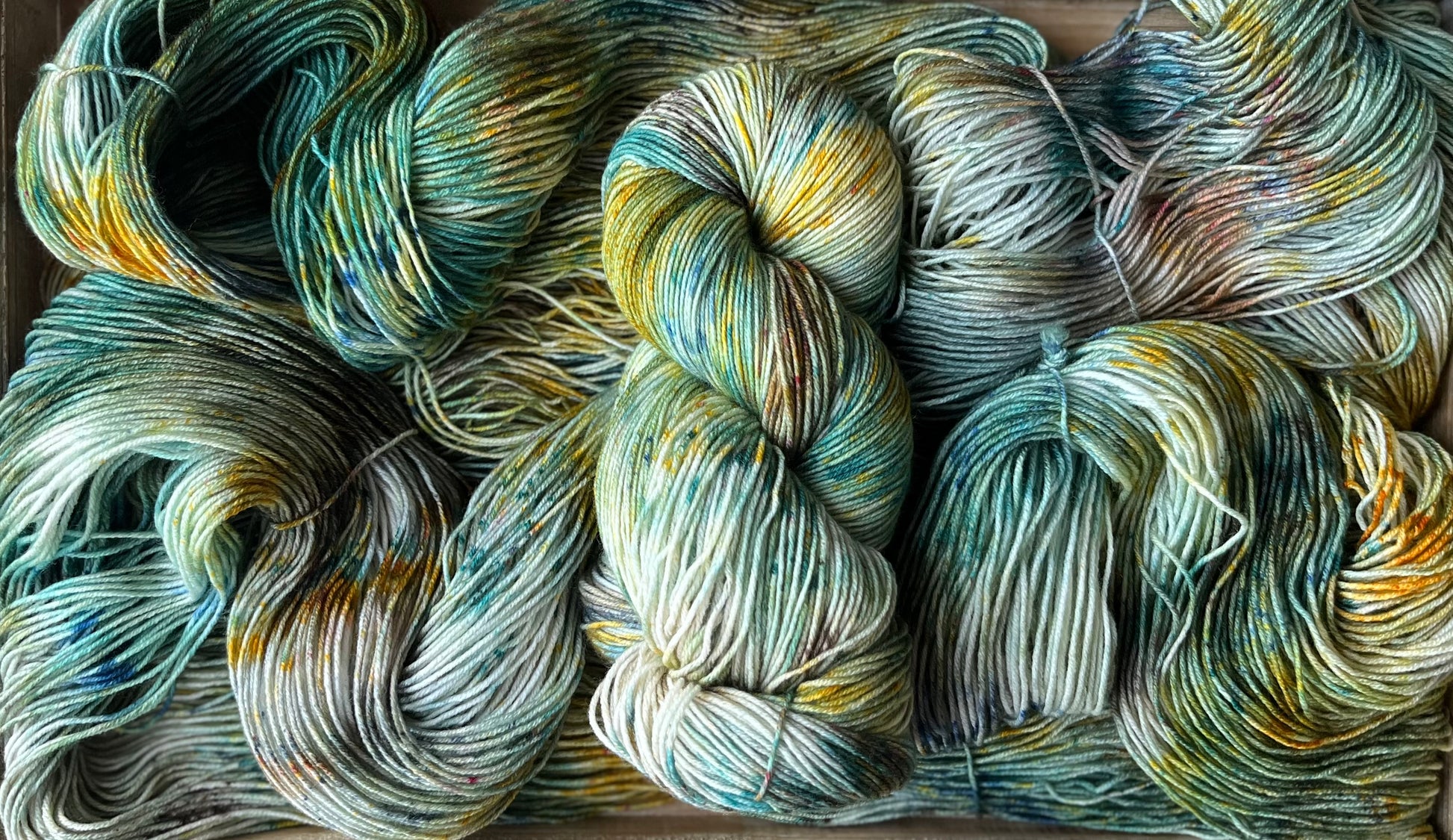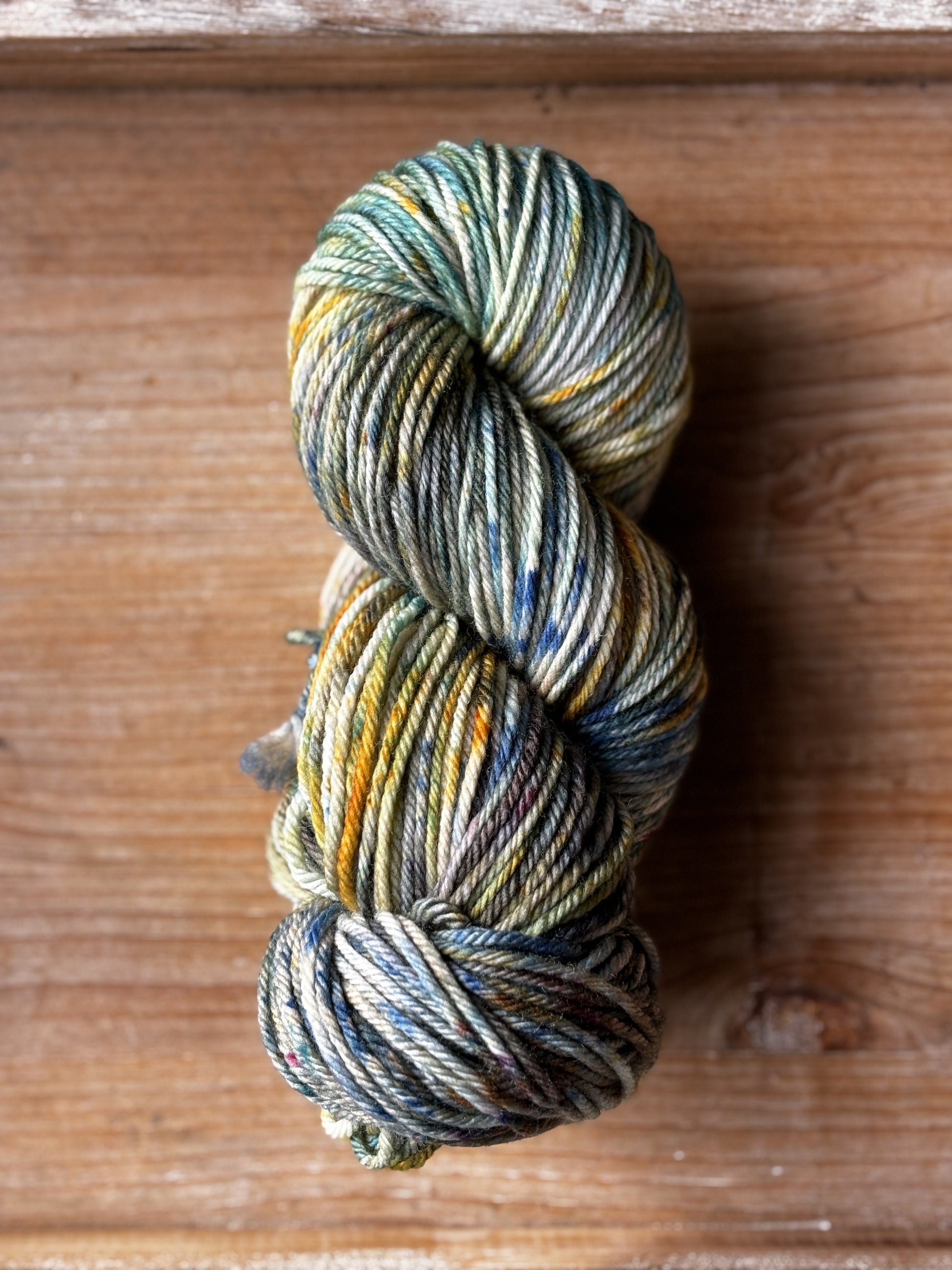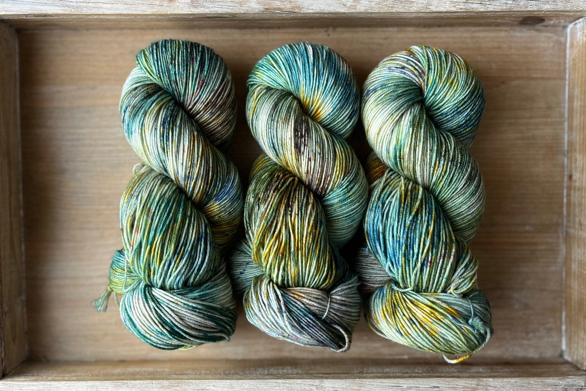 Tupelo Honey is such a gorgeous mix of golds, blues and greens, with tons of speckles to keep things lively. Photographing these colourways was challenging, because it's difficult to capture how truly special each skein is. Even when dyed in the same batch, in the same pan, each skein is truly one of a kind. And once twisted into a skein, we loose a lot of visibility of the swirling blends of colours and speckles. Once you unwrap the yarn, all the beauty is released and you can really see how special these colourways are. Alternating skeins in between rows is suggested when using any colourway like this one!