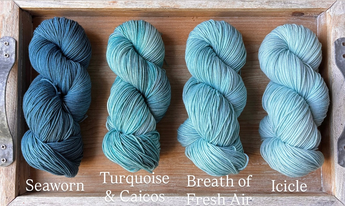 Turquoise and Caicos is a striking and exciting blend of multiple shades of blue. Marine, Turquoise, Denim and Sky Blue are some of the shades you'll find in this gorgeous variegated yarn. It was tricky to photograph, and I wish I had more photos to show off this lively colourway, but these are the best and more accurate ones.