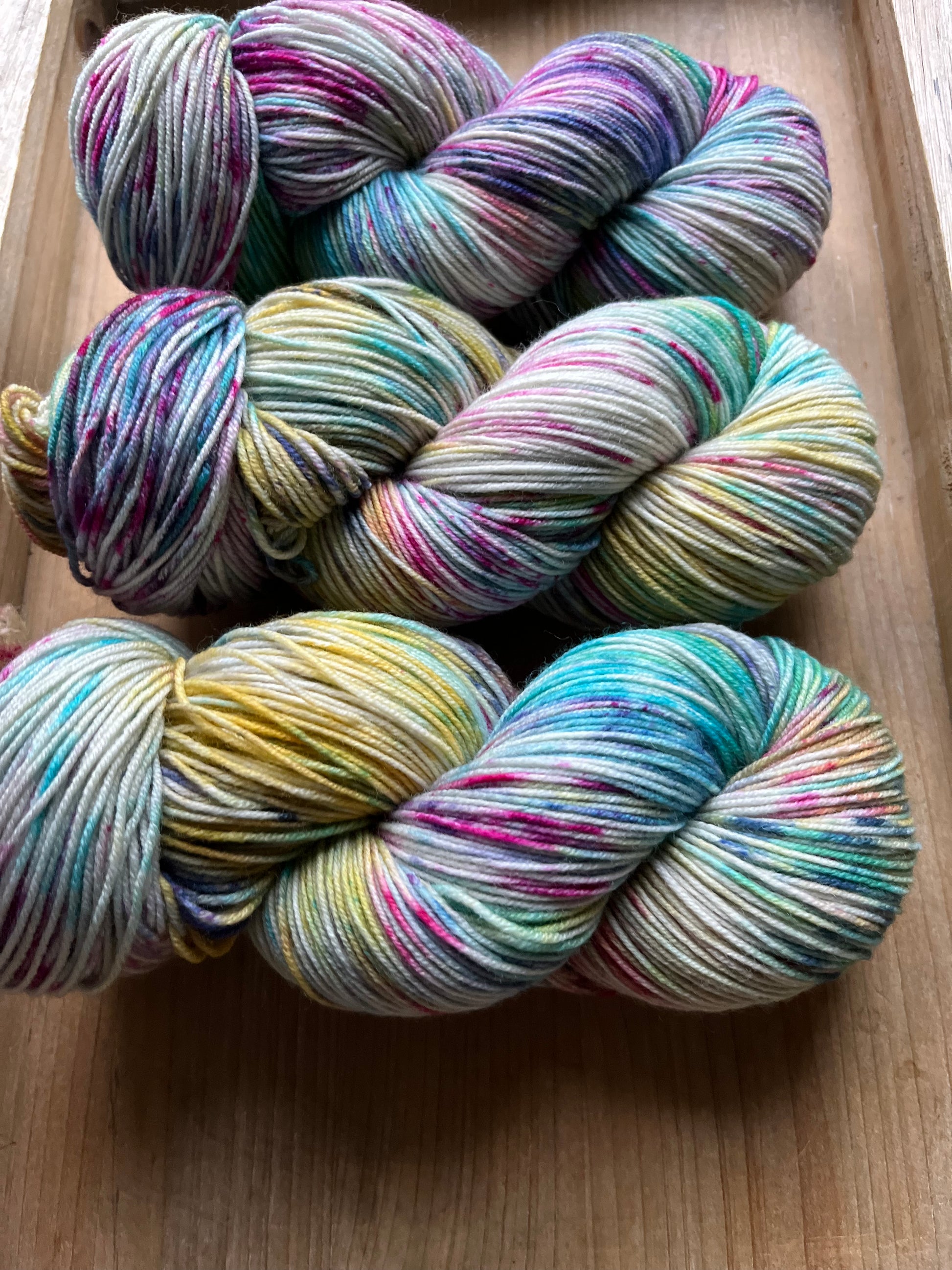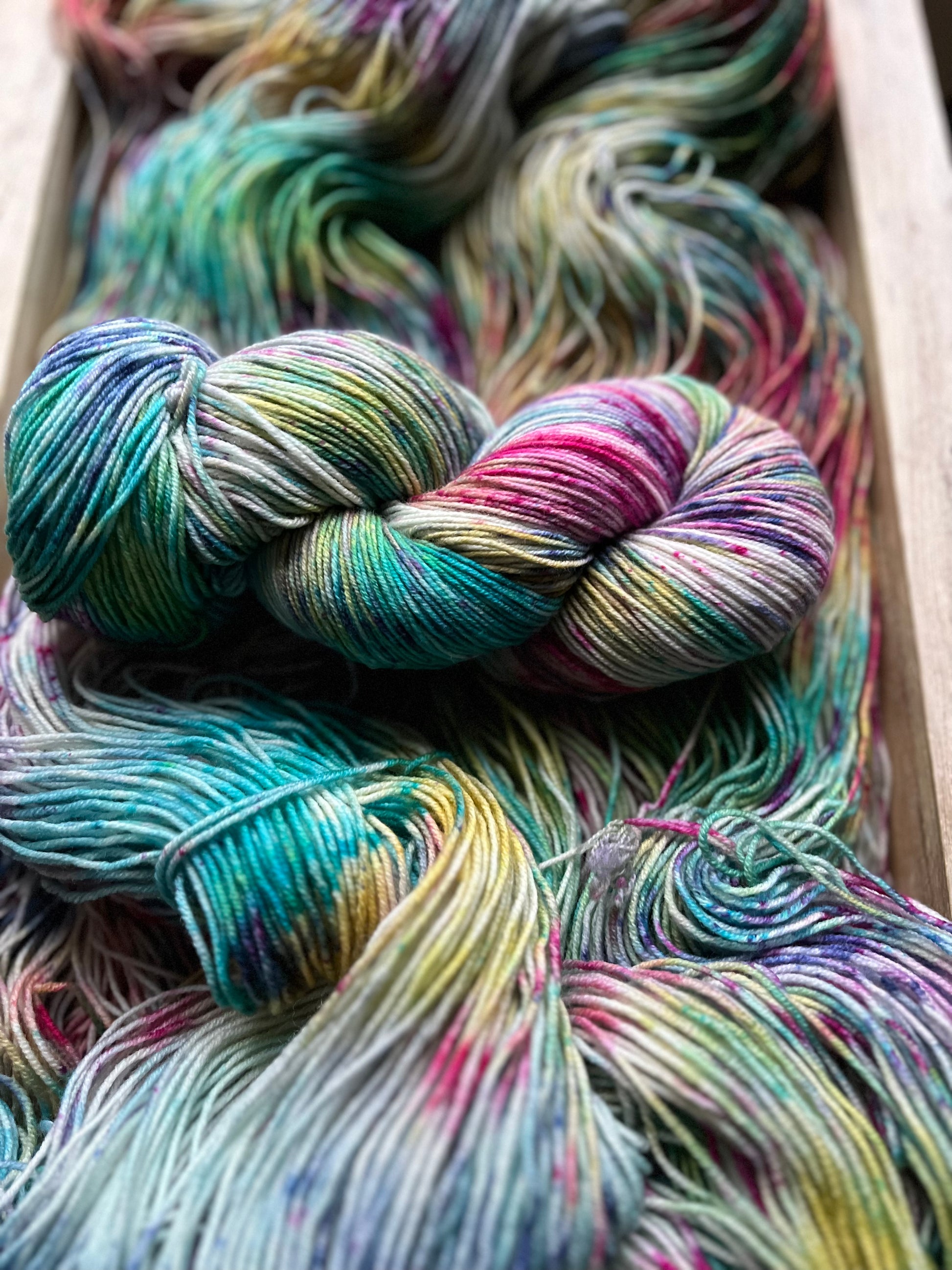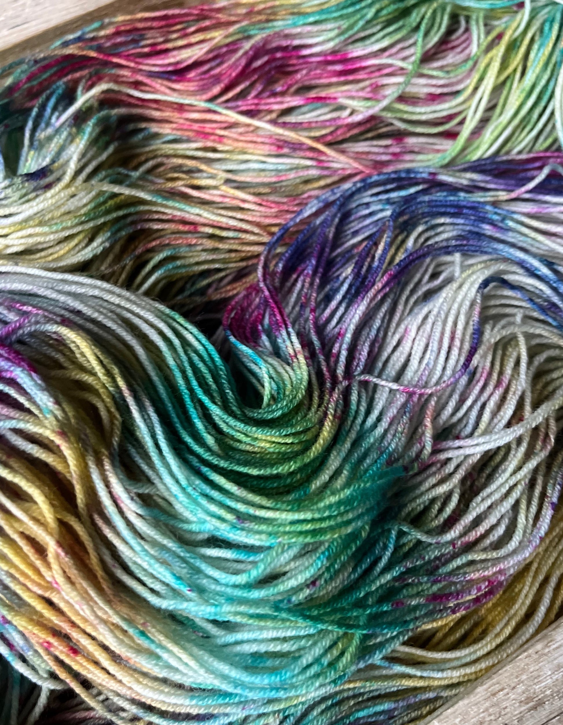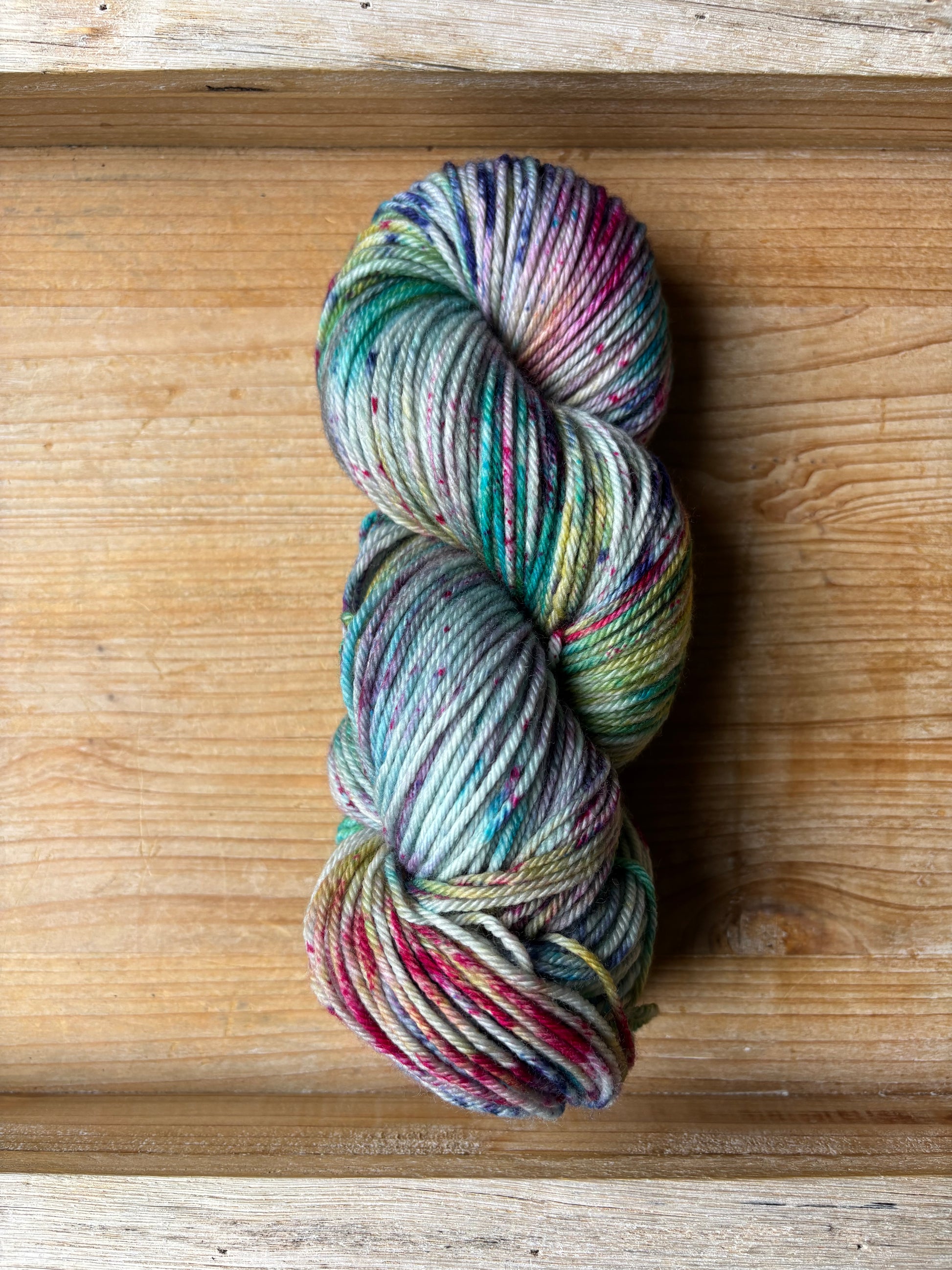 This delightfully fun colourway was inspired by my daughter, who loves rainbow everything! Anchored on a grey base, the speckles of purples, pinks, blues, with swirls of yellow and greens will enchant you, and bring a touch of magic to your next project!