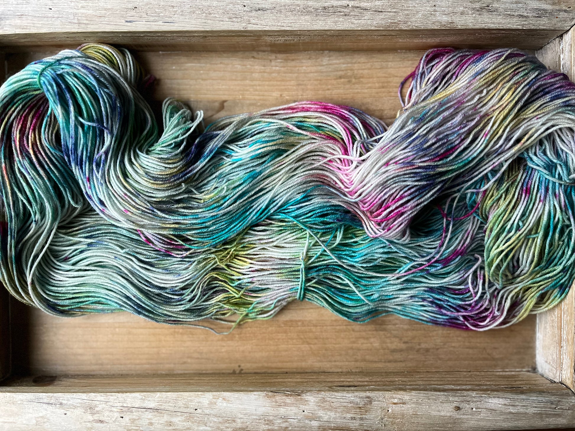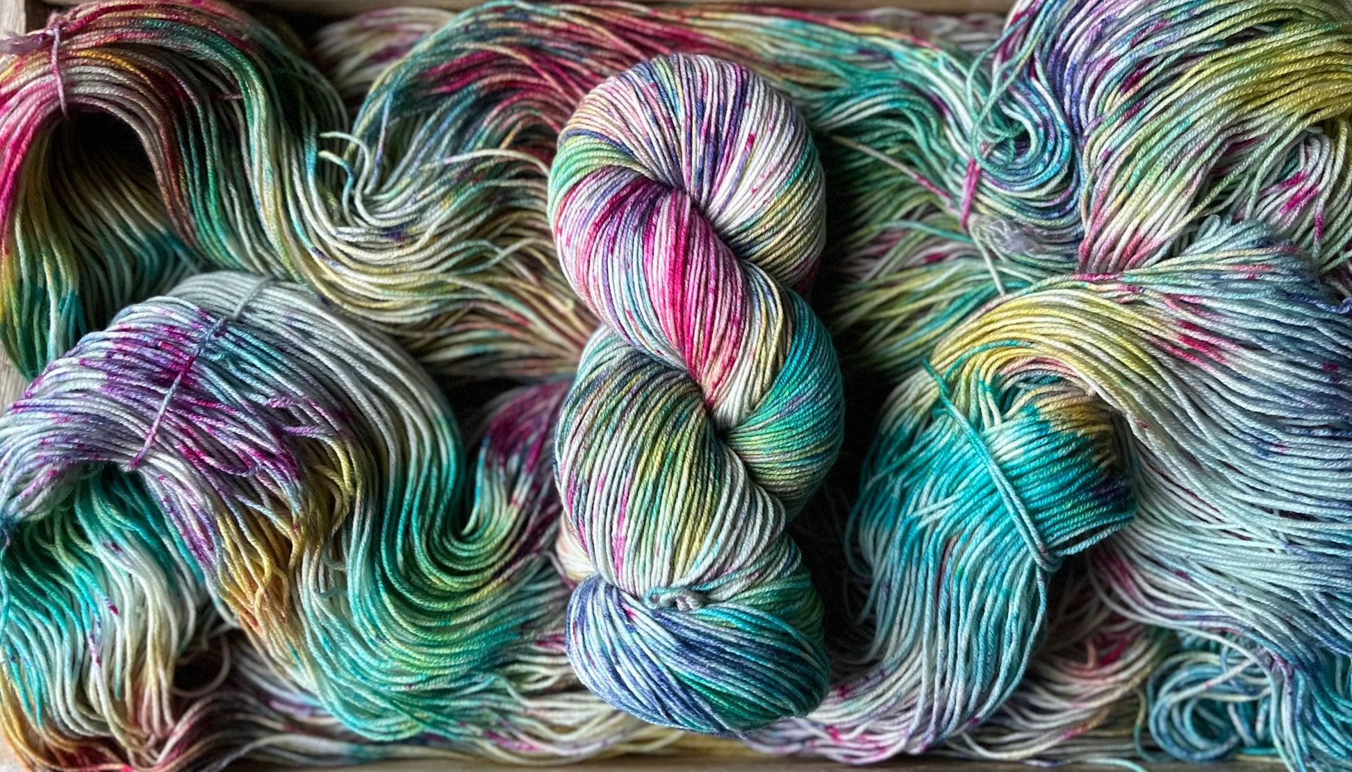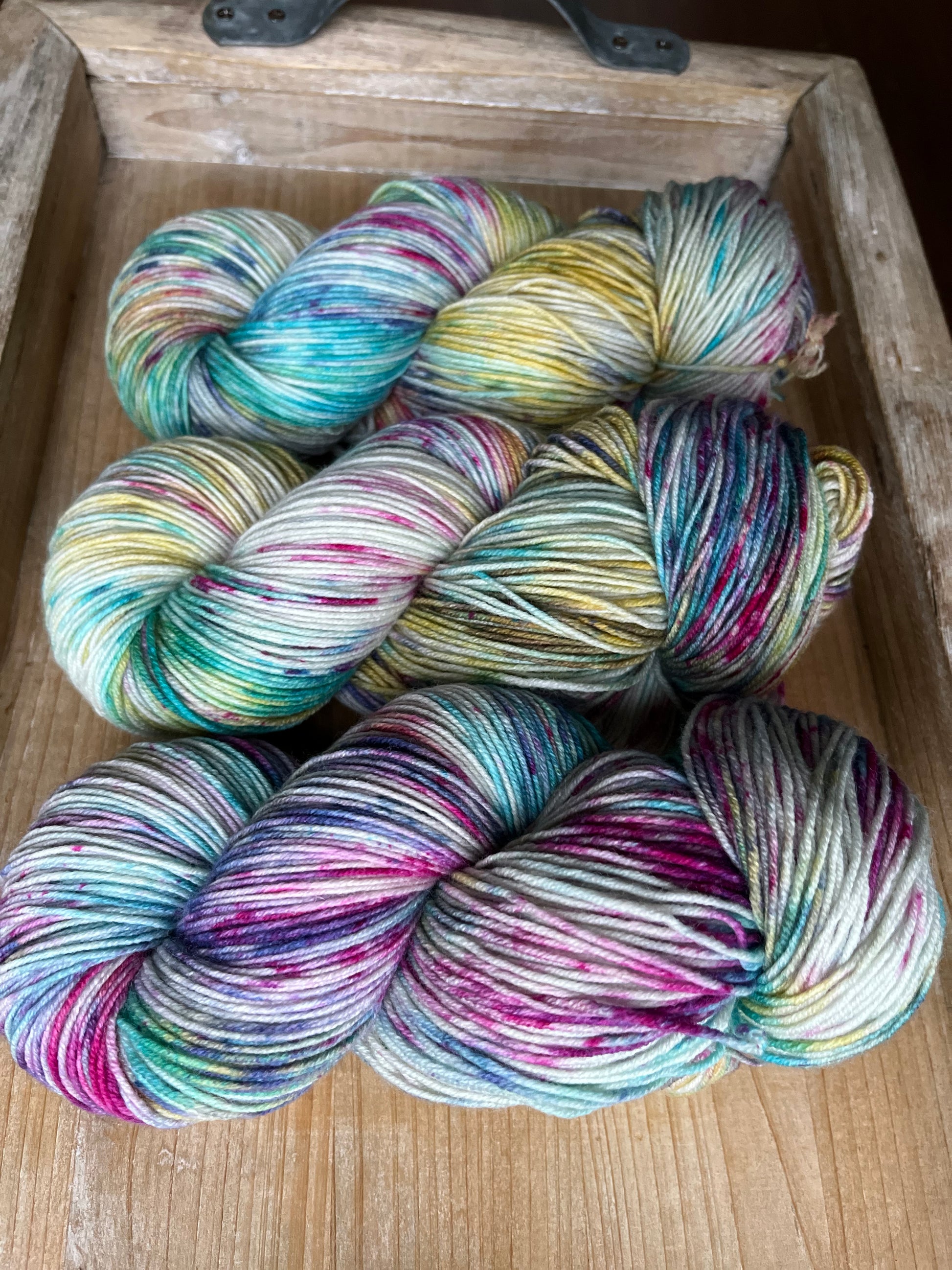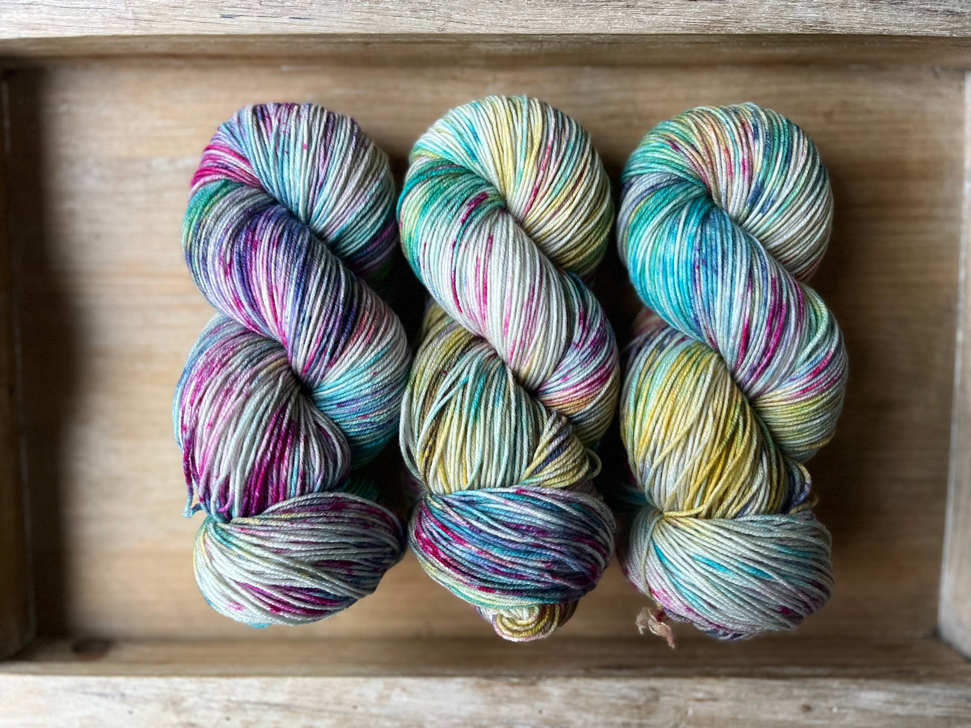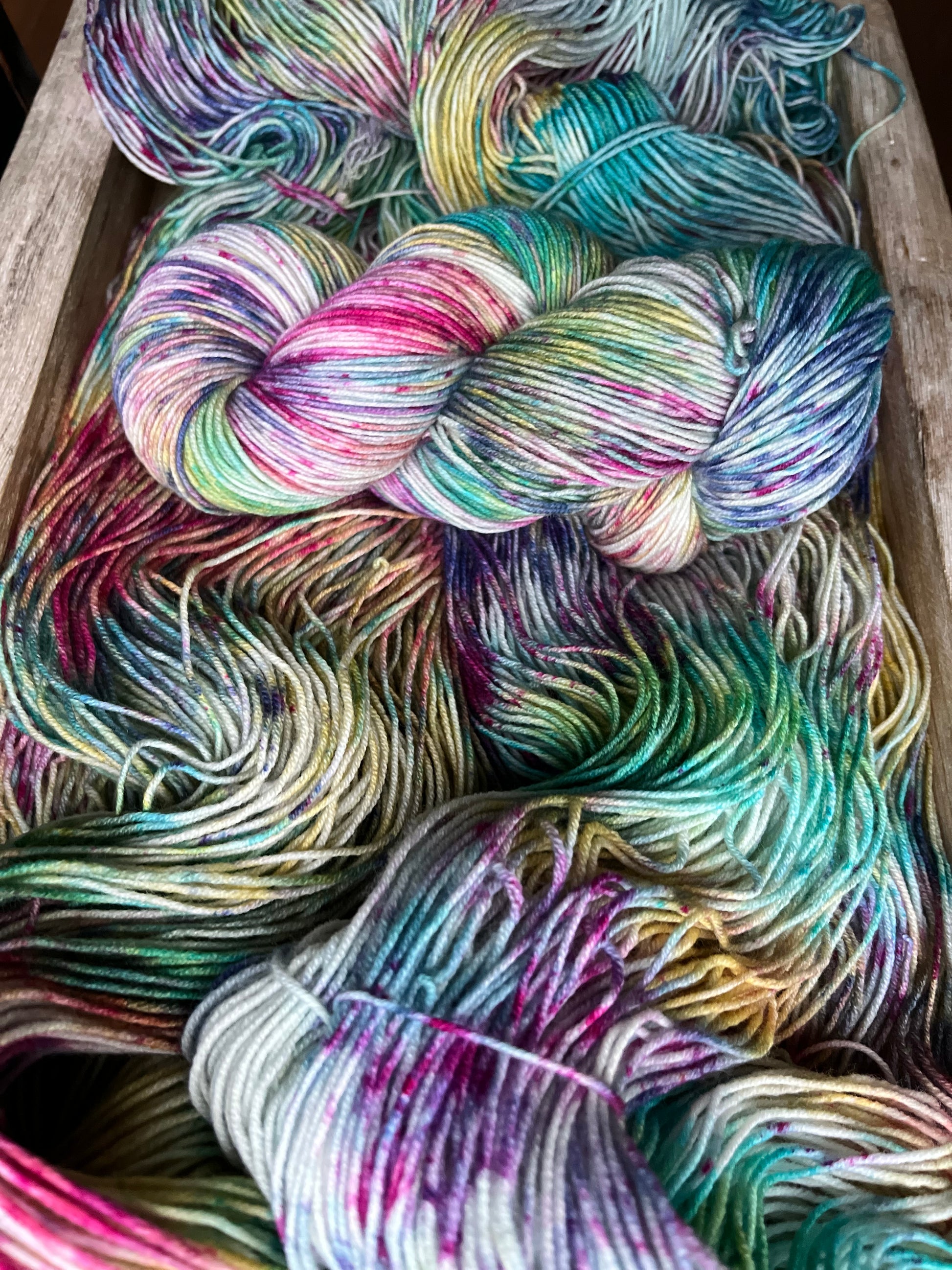This delightfully fun colourway was inspired by my daughter, who loves rainbow everything! Anchored on a grey base, the speckles of purples, pinks, blues, with swirls of yellow and greens will enchant you, and bring a touch of magic to your next project!