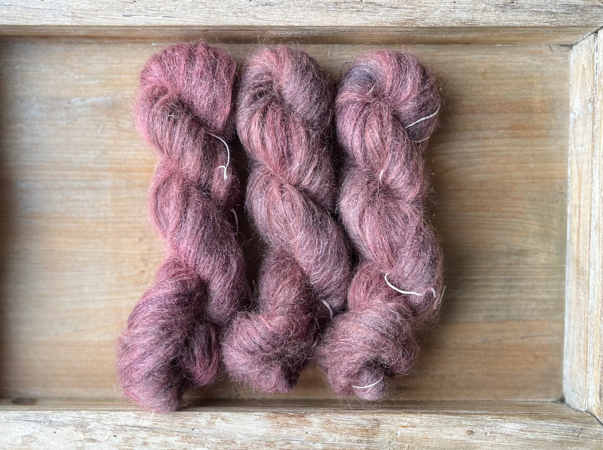 Yes, Suri! Lace Base: Take your project to the next level of luxury with this gorgeous lace weight yarn base! Made up of 75% Brushed Baby Suri Alpaca, and 25% Mulberry Silk, each 50 gram skein comes with 328 yards of fluffy magic. This base can be somewhat of a wild card when it comes to dye recipe consistency, as is often the case with Alpaca blends, so please do not hesitate to reach out to me as I’m always happy to send ‘preview photos’ before shipping, just to make sure we get it right! Yes, Suri! is significantly softer than Mohair Halo and is a great choice for anyone who wants something less itchy for next to skin wear. This base has a bit more drape and creates a less stiff fabric than Mohair Halo. Fibres in this yarn base are sourced from South America. Hand wash only, lay flat to dry, and colour bleeding is quite typical for the first few washes, so swatching to test for colour transfer is recommended