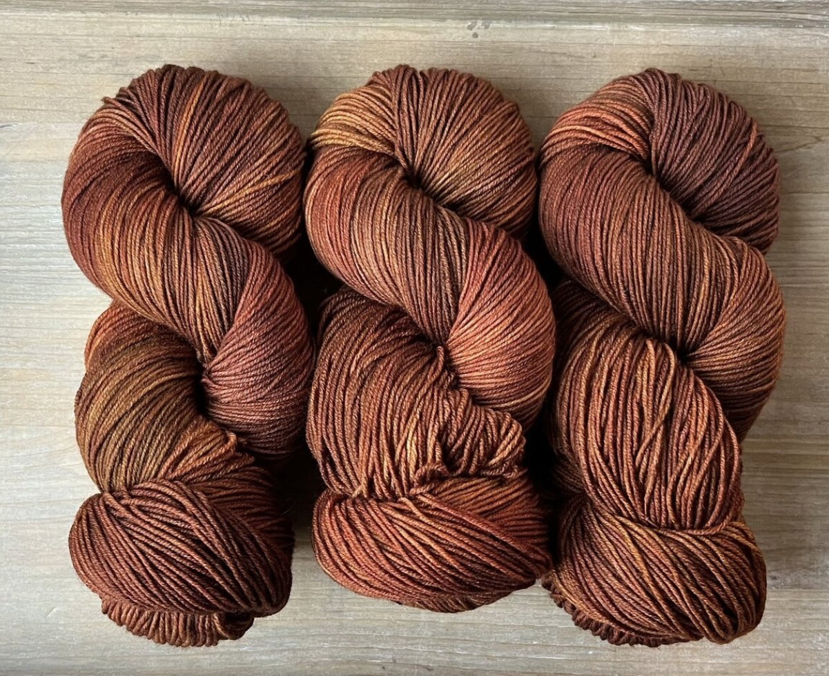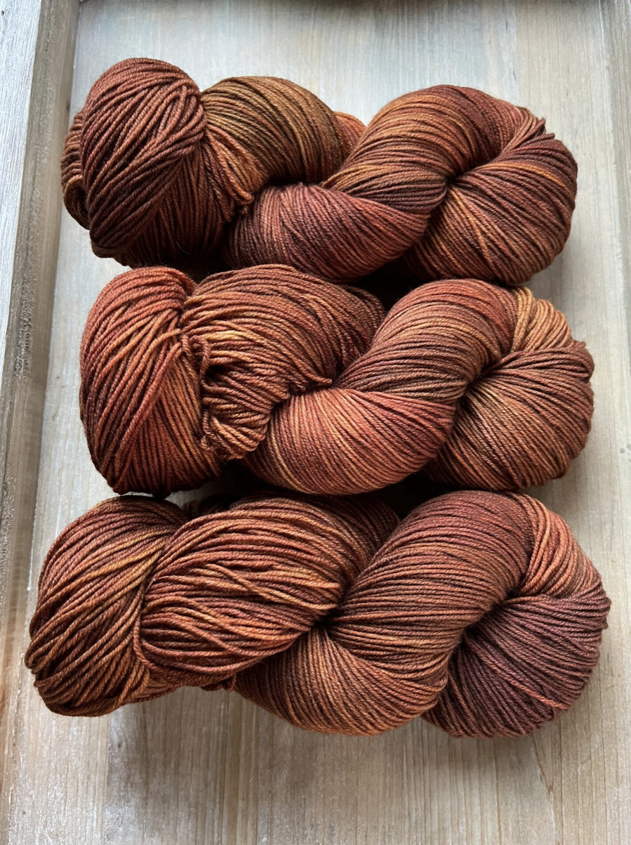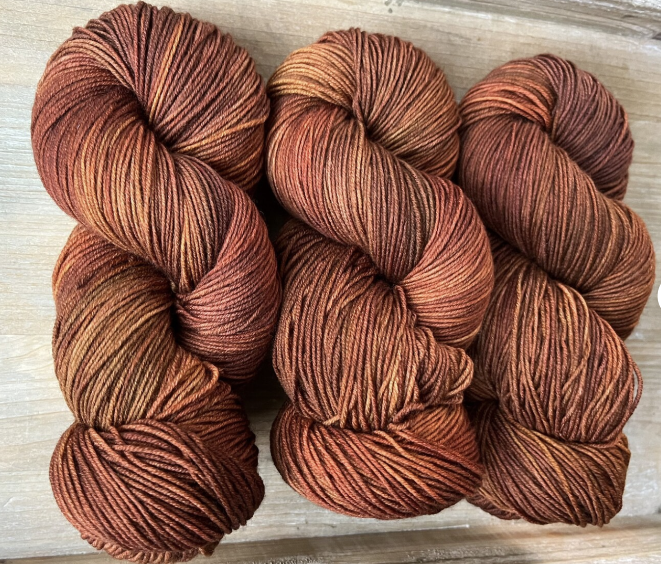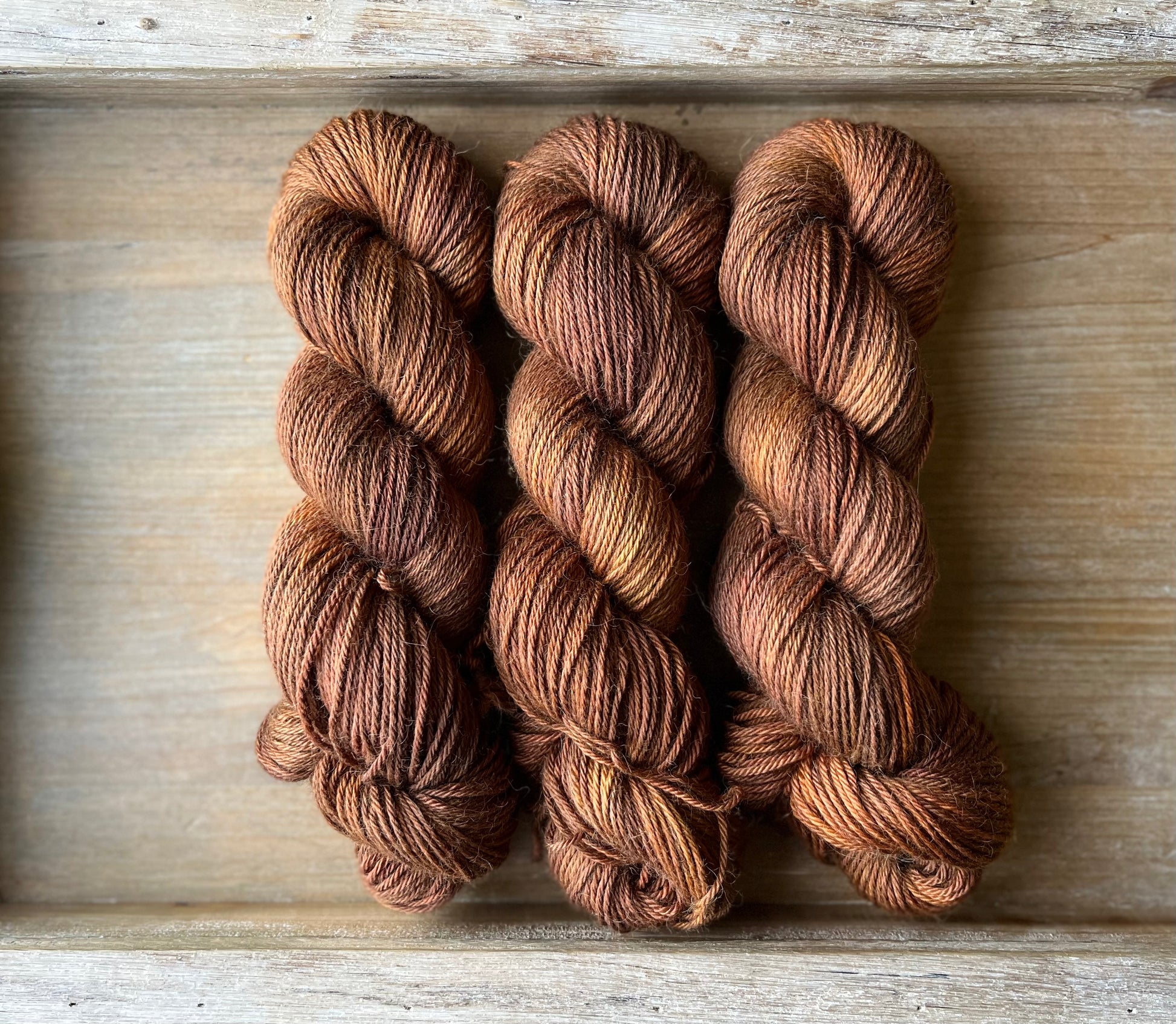Warm and Toasty is a spectacular, rich colourway. Full of rusty oranges, caramel browns, and coppers. Absolutely stunning on it's own, or paired alongside other deep colourways like Inkwell, Witch Boots or All Star.