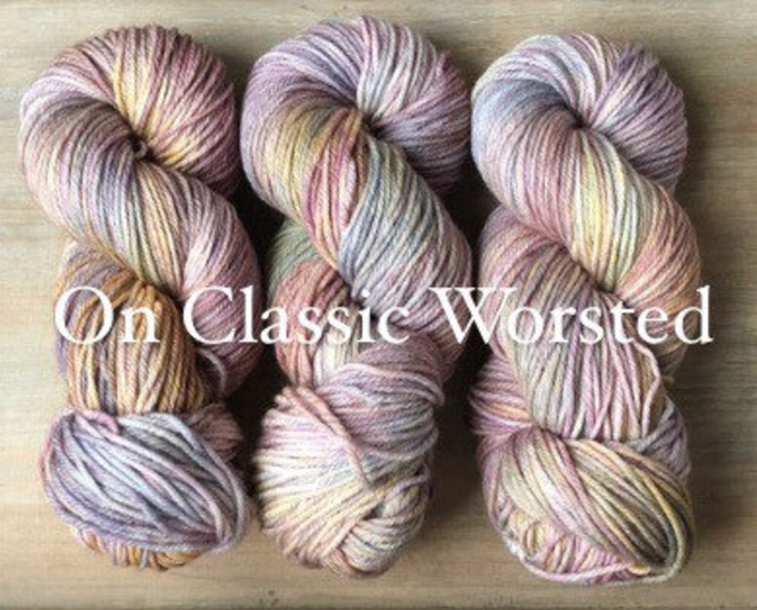 Classic Worsted Base: A soft and full Worsted Base yarn, made up of 100% Superwash Merino Wool. Each skein is 110 grams and 205 yards, with a 4 ply construction. It is plush, and versatile, with terrific stitch definition. And thanks to it’s superwash treatment, it is also machine washable on a delicate cycle. A great, practical choice for any project calling for a Worsted Weight base. Fibres in this base are sourced from Australia.