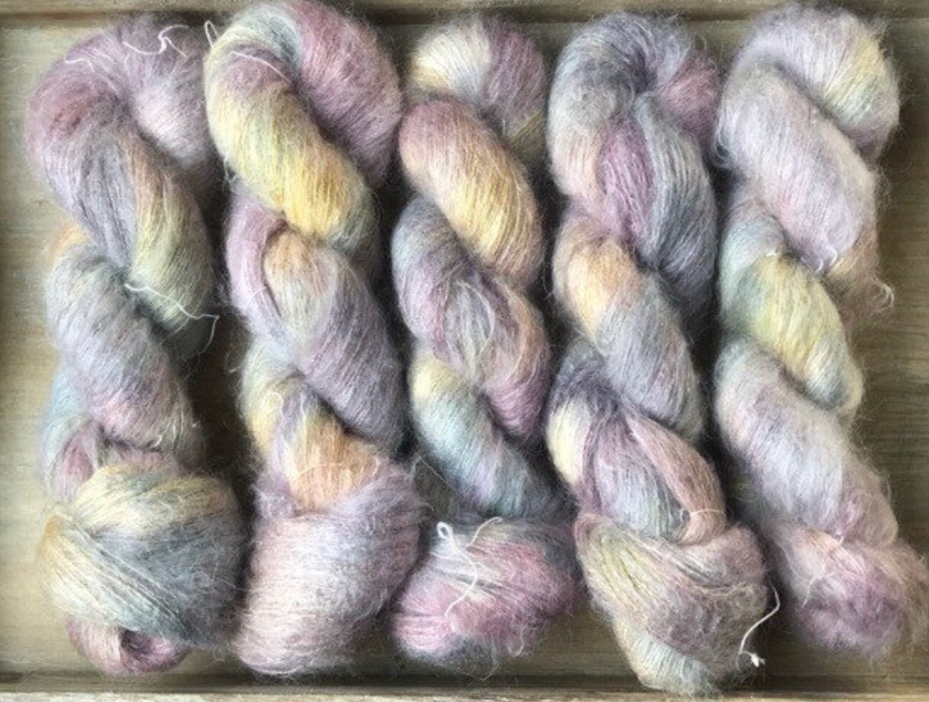 Mohair Halo Base: A delicate, lace weight yarn made up of 72% Superkid Mohair and 28% Mulberry Silk. Each skein is 50 grams and 460 yards, single ply construction. This yarn is lovely on it’s own, but is also amazing when held together with another yarn base. The fuzziness of the mohair creates a halo of colour within your project. Fibres in this base are sourced from South Africa. Hand wash only, lay flat to dry.