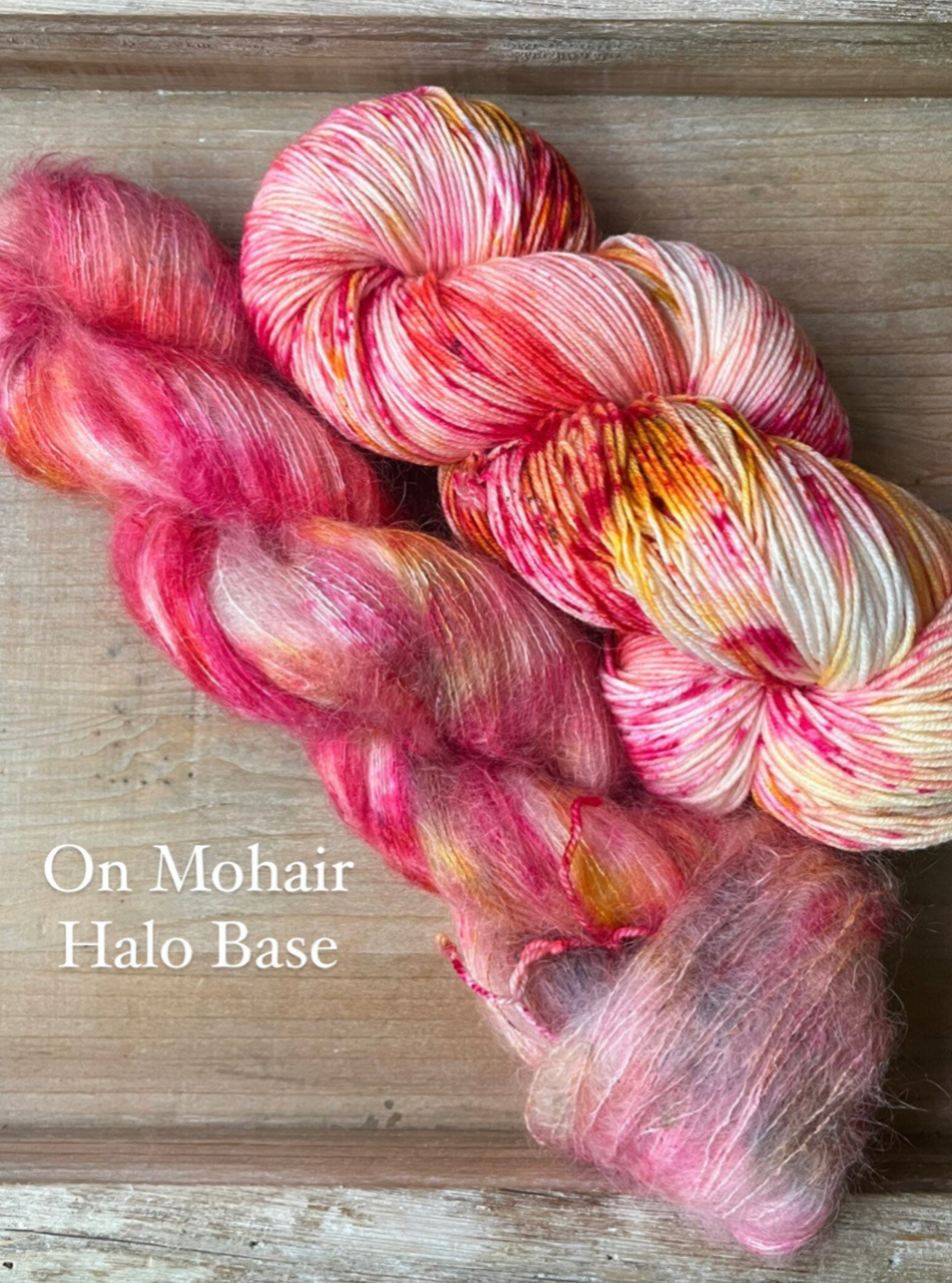 Mohair Halo Base: A delicate, lace weight yarn made up of 72% Superkid Mohair and 28% Mulberry Silk. Each skein is 50 grams and 460 yards, single ply construction. This yarn is lovely on it’s own, but is also amazing when held together with another yarn base. The fuzziness of the mohair creates a halo of colour within your project. Fibres in this base are sourced from South Africa. Hand wash only, lay flat to dry.