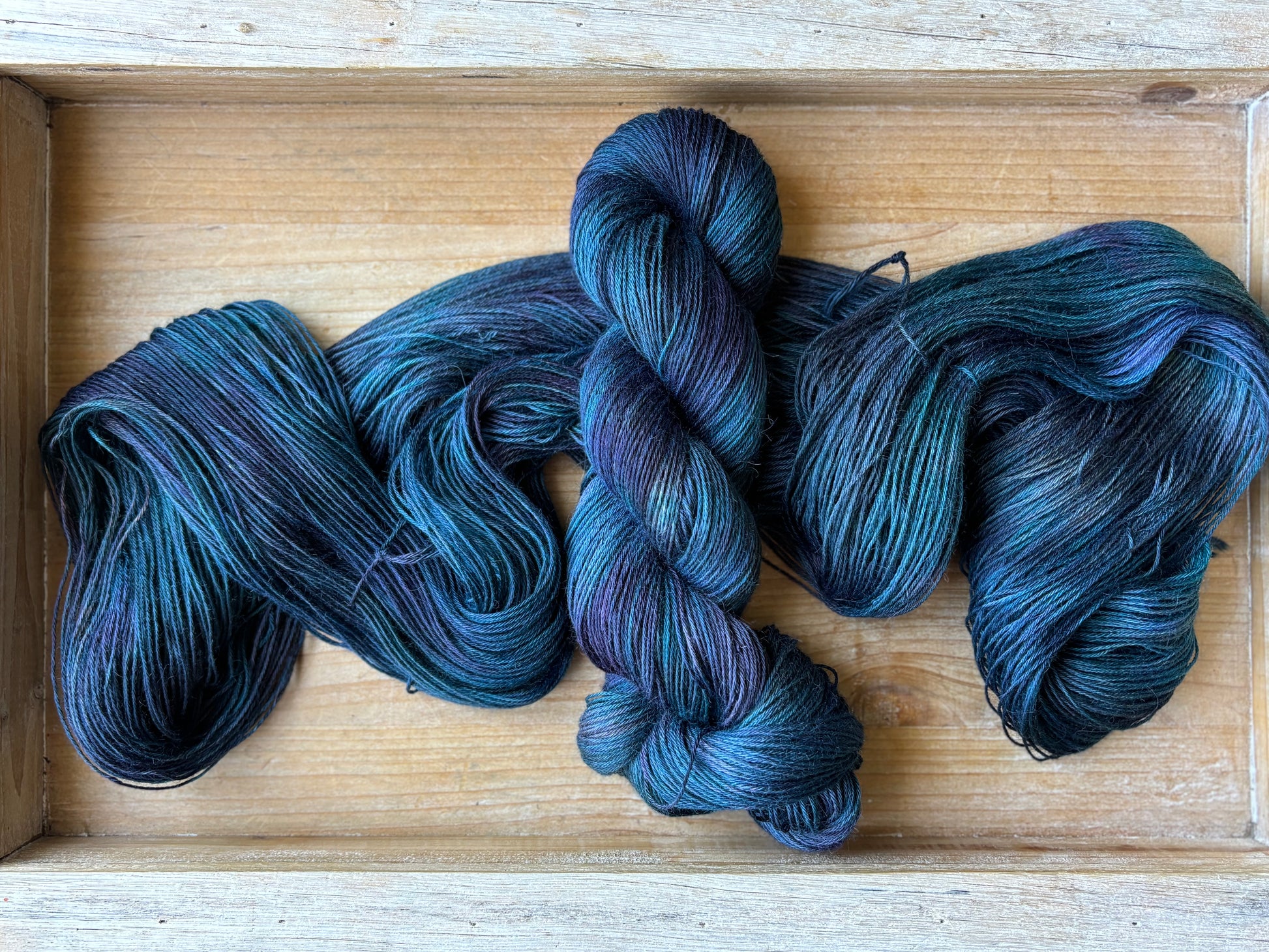 Lustrous Lace Base: This very thin, very fine lace weight yarn is both luxurious yet practical. Made up of 75% Extrafine Superwash Merino, and 25% Mulberry Silk, this base is so very soft, and the colours of dye simply glow throughout each skein. 100 grams and 875 yards, this yarn base is a 2ply construction. A stunning choice for shawls and light summer garments, this yarn base has a lovely drape and is very comfortable to wear next to the skin. Fibres in this base are sourced from Australia, the wool used in this yarn is ethically produced from sheep that have NOT been mulesed.. Hand wash only, lay flat to dry.