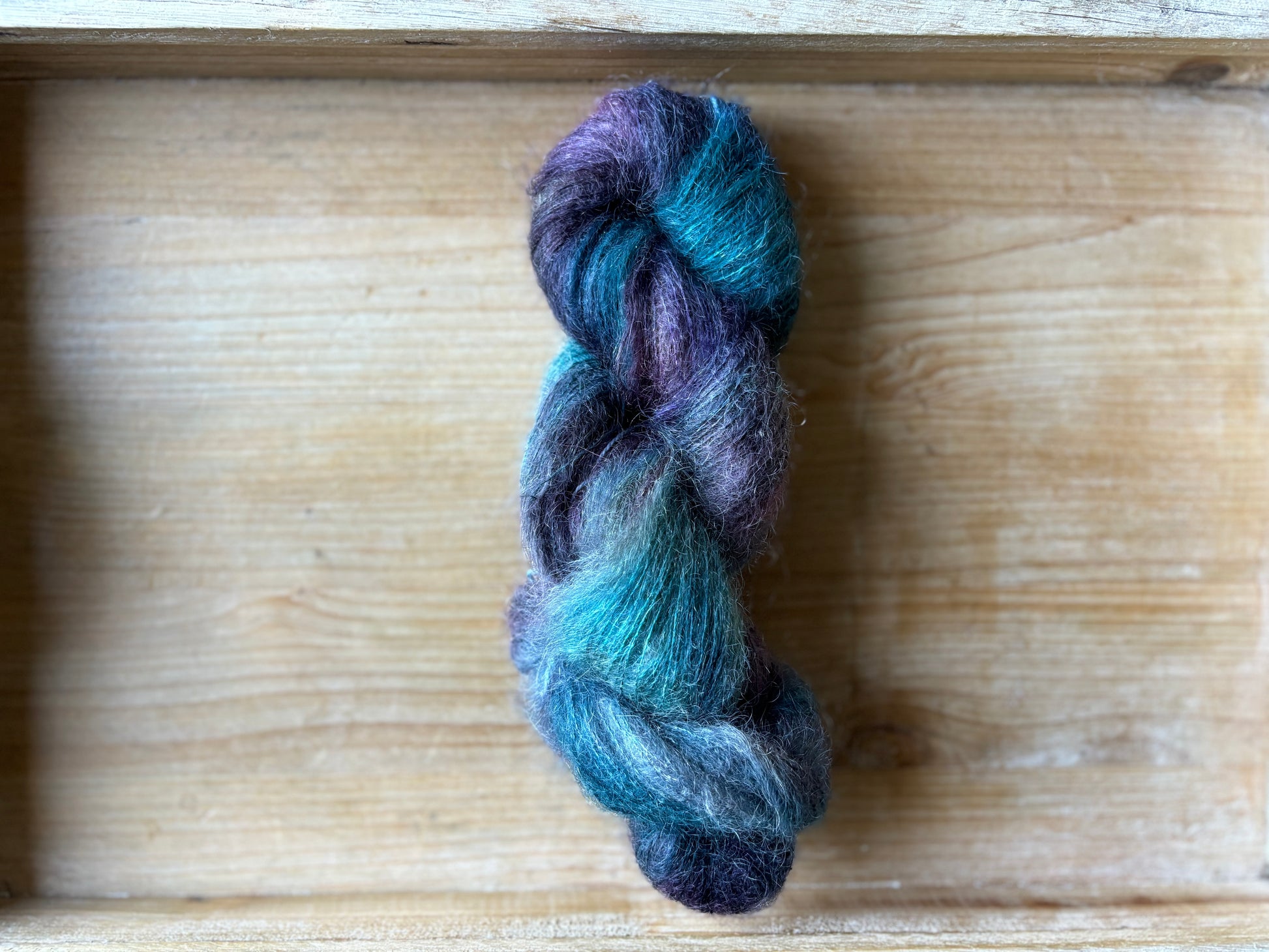 Yes, Suri! Lace Base: Take your project to the next level of luxury with this gorgeous lace weight yarn base! Made up of 75% Brushed Baby Suri Alpaca, and 25% Mulberry Silk, each 50 gram skein comes with 328 yards of fluffy magic. This base can be somewhat of a wild card when it comes to dye recipe consistency, as is often the case with Alpaca blends, so please do not hesitate to reach out to me as I’m always happy to send ‘preview photos’ before shipping, just to make sure we get it right! Yes, Suri! is significantly softer than Mohair Halo and is a great choice for anyone who wants something less itchy for next to skin wear. This base has a bit more drape and creates a less stiff fabric than Mohair Halo. Fibres in this yarn base are sourced from South America. Hand wash only, lay flat to dry, and colour bleeding is quite typical for the first few washes, so swatching to test for colour transfer is recommended