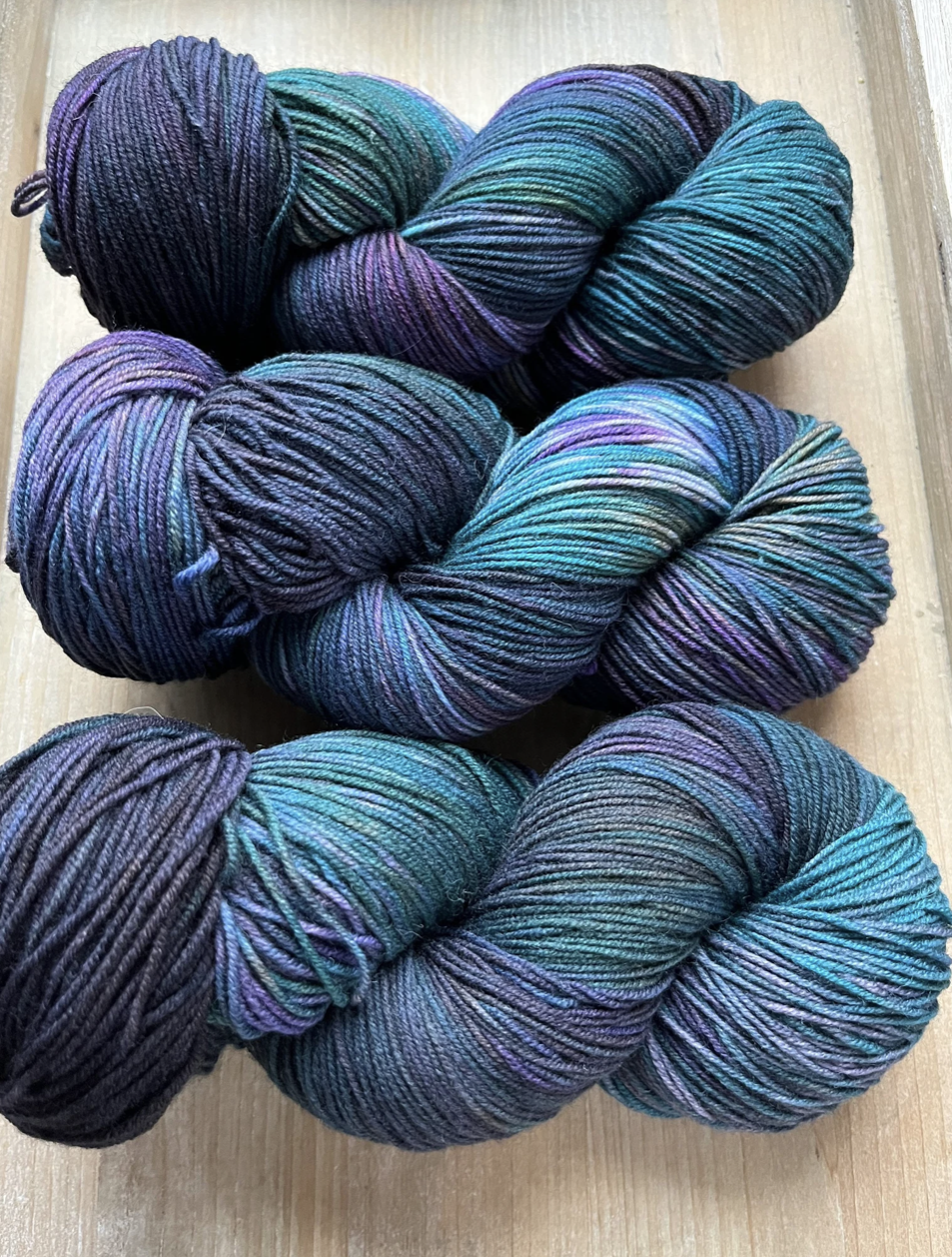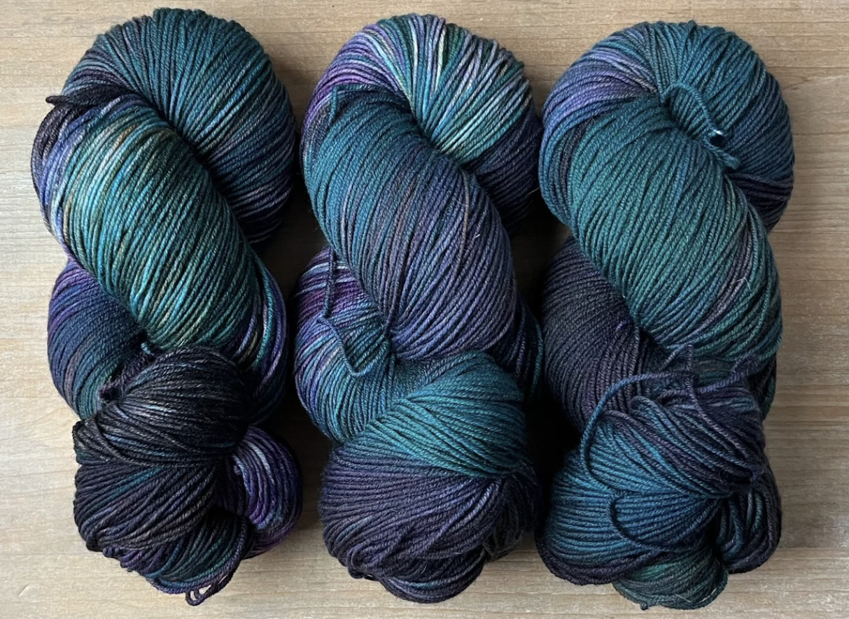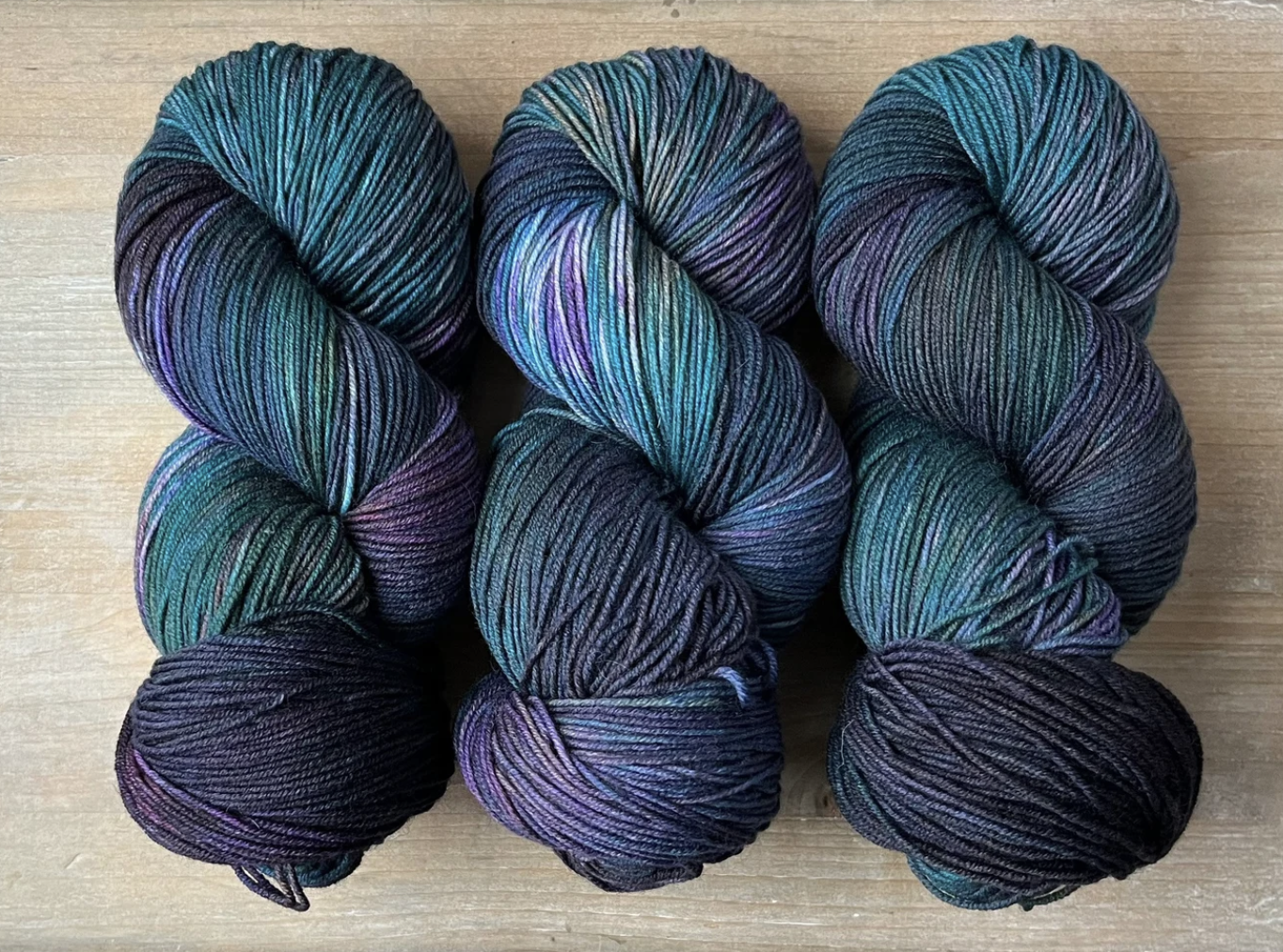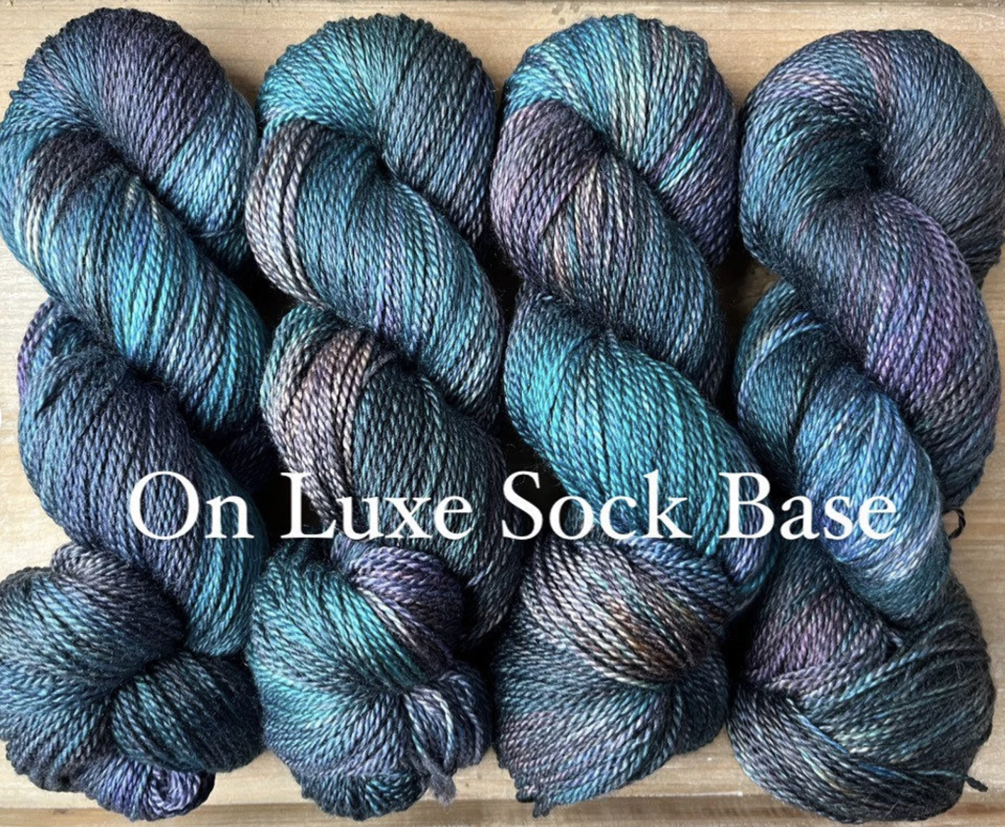 Luxe Sock Base: Luxe Sock is made up of 75% Ultra Fine Merino Wool, 15% Mulberry Silk, and 10% Cashmere. Each skien is 100 grams and 437 yards, 2ply construction. This yarn base is heavenly soft against the skin, and perfect for a special project calling for a high end fingering weight yarn. The Mulberry Silk adds drape and lustre, and the cashmere creates a fuzzy halo effect as you work with it. The colours of dye tend to shine through, looking much more striking and rich compared to some of my samples on Superwash bases. Fibres in this base are sourced from Australia, the wool used in this yarn is ethically produced from sheep that have NOT been mulesed. Hand wash only, lay flat to dry.