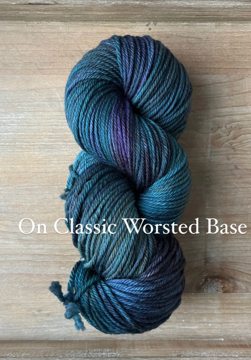 Classic Worsted Base: A soft and full Worsted Base yarn, made up of 100% Superwash Merino Wool. Each skein is 110 grams and 205 yards, with a 4 ply construction. It is plush, and versatile, with terrific stitch definition. And thanks to it’s superwash treatment, it is also machine washable on a delicate cycle. A great, practical choice for any project calling for a Worsted Weight base. Fibres in this base are sourced from Australia.